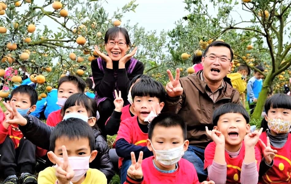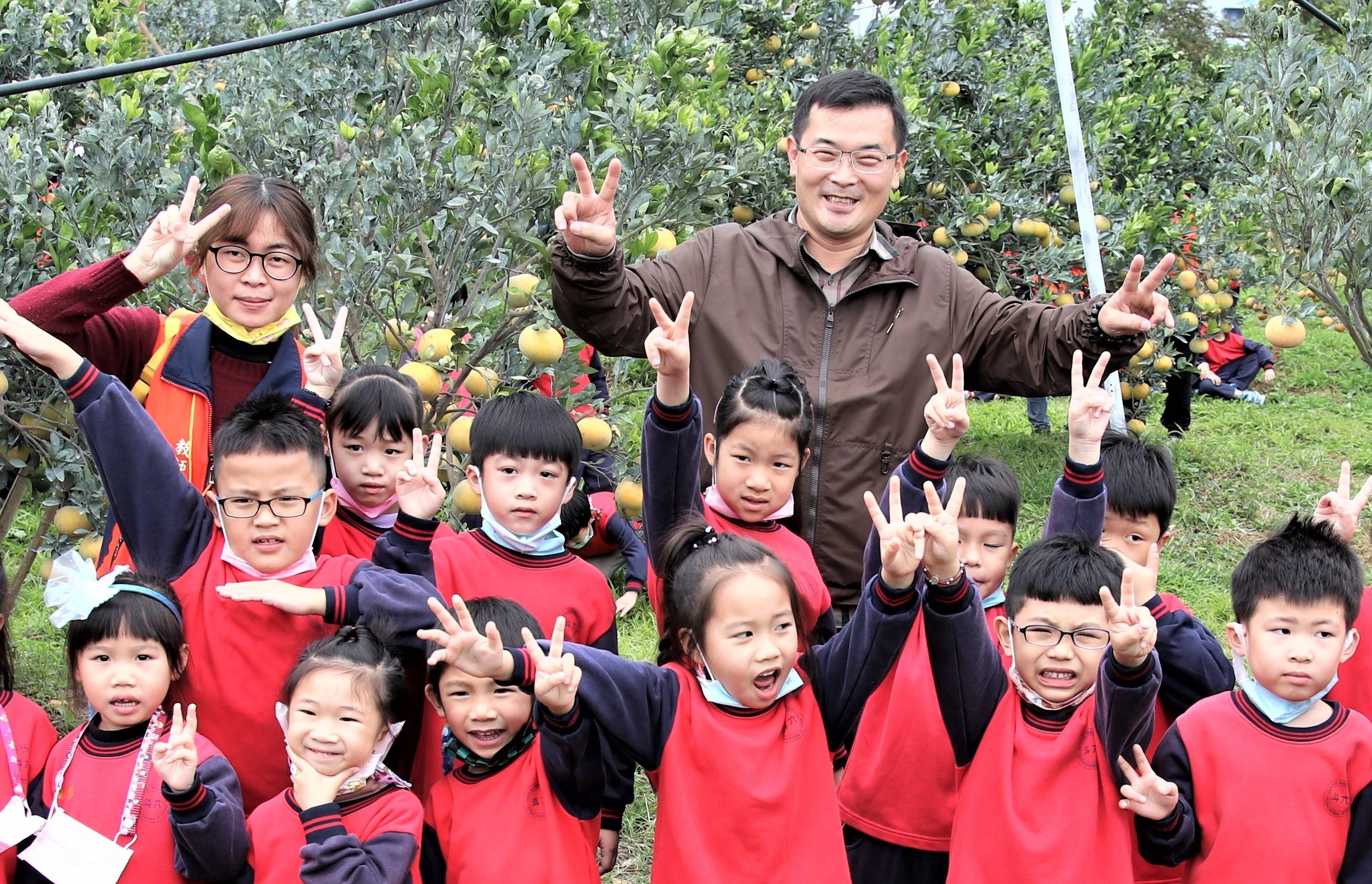市長林聖爵(後右)與小朋友們親切互動,聽茂谷柑生態故事,現採鮮甜果實,讓孩童們更加了解家鄉知名農作物,教育他們友善環境。