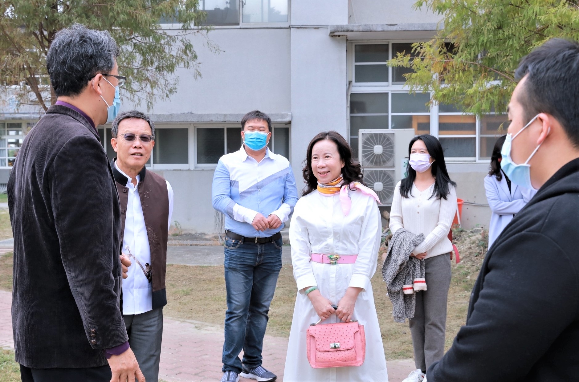 嘉楠建設董事長鐘淑宜(右3)等人,參觀優美校園藝術環境之美。