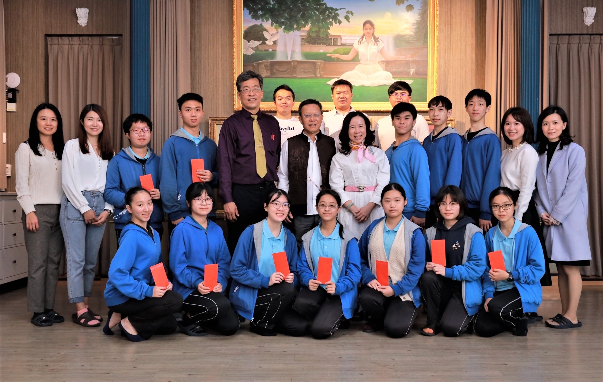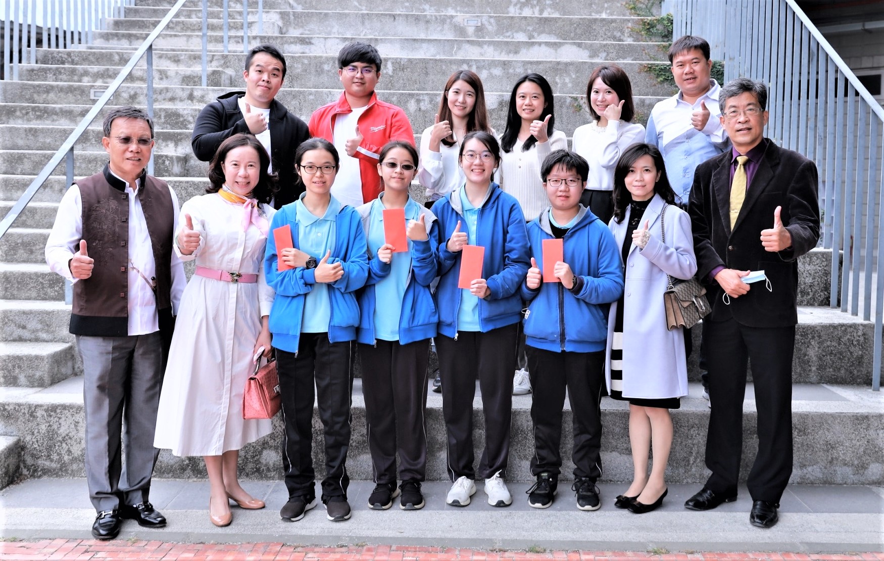 嘉楠建設董事長鐘淑宜(中右6)與校長張凱瑞(左5)等人與獲獎學生分享榮耀與喜悅。