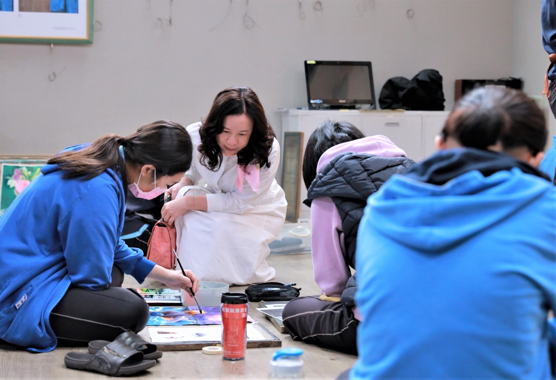 嘉楠建設董事長鐘淑宜(左2)參觀美術班學生作畫,十分肯定學生們才華洋溢。