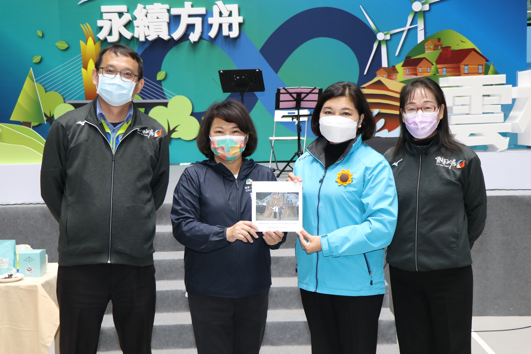 市長黃敏惠(左2)贈送縣長張麗善(右2)到嘉義市台灣設計展觀展照片留念。