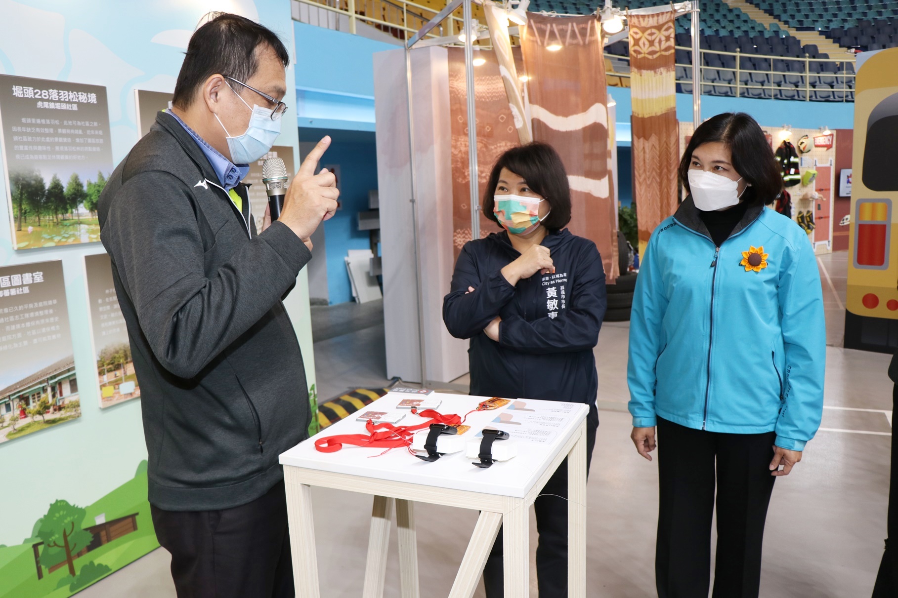 嘉義市長黃敏惠(中)由雲林縣長張麗善(右)陪同,聽取縣府計畫處長李明岳(左)導覽特展內容。