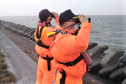 海巡人員以望眼鏡搜尋墜海戰機蹤跡。