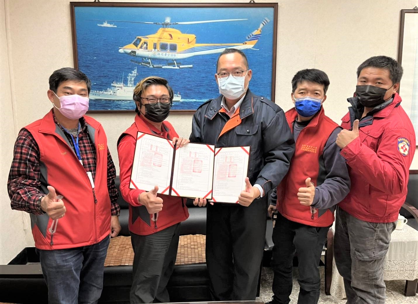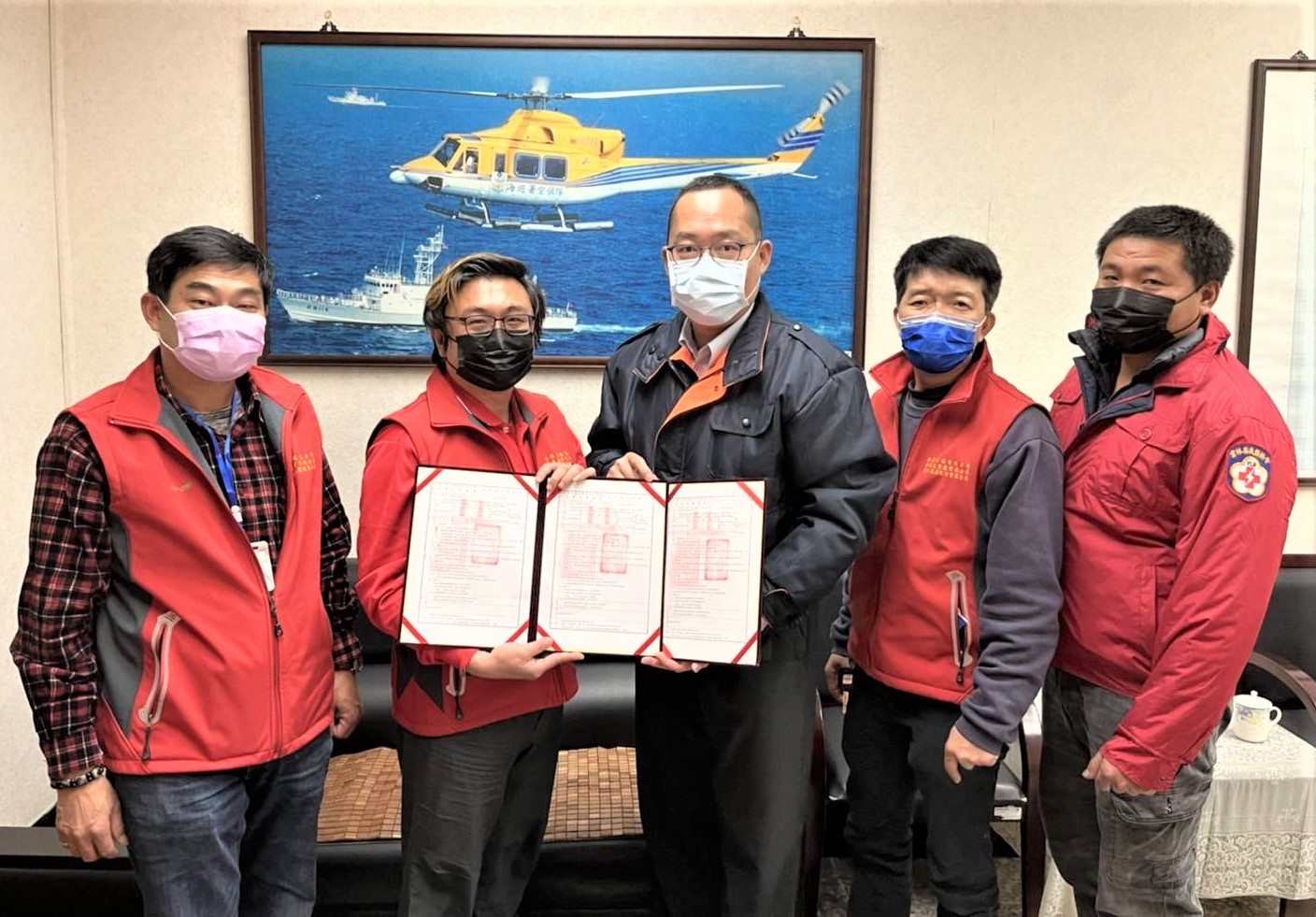 雲林縣救難協會理事長黃坤原(左2)與第四岸巡隊隊長姚天騤(右3)簽署支援協定。