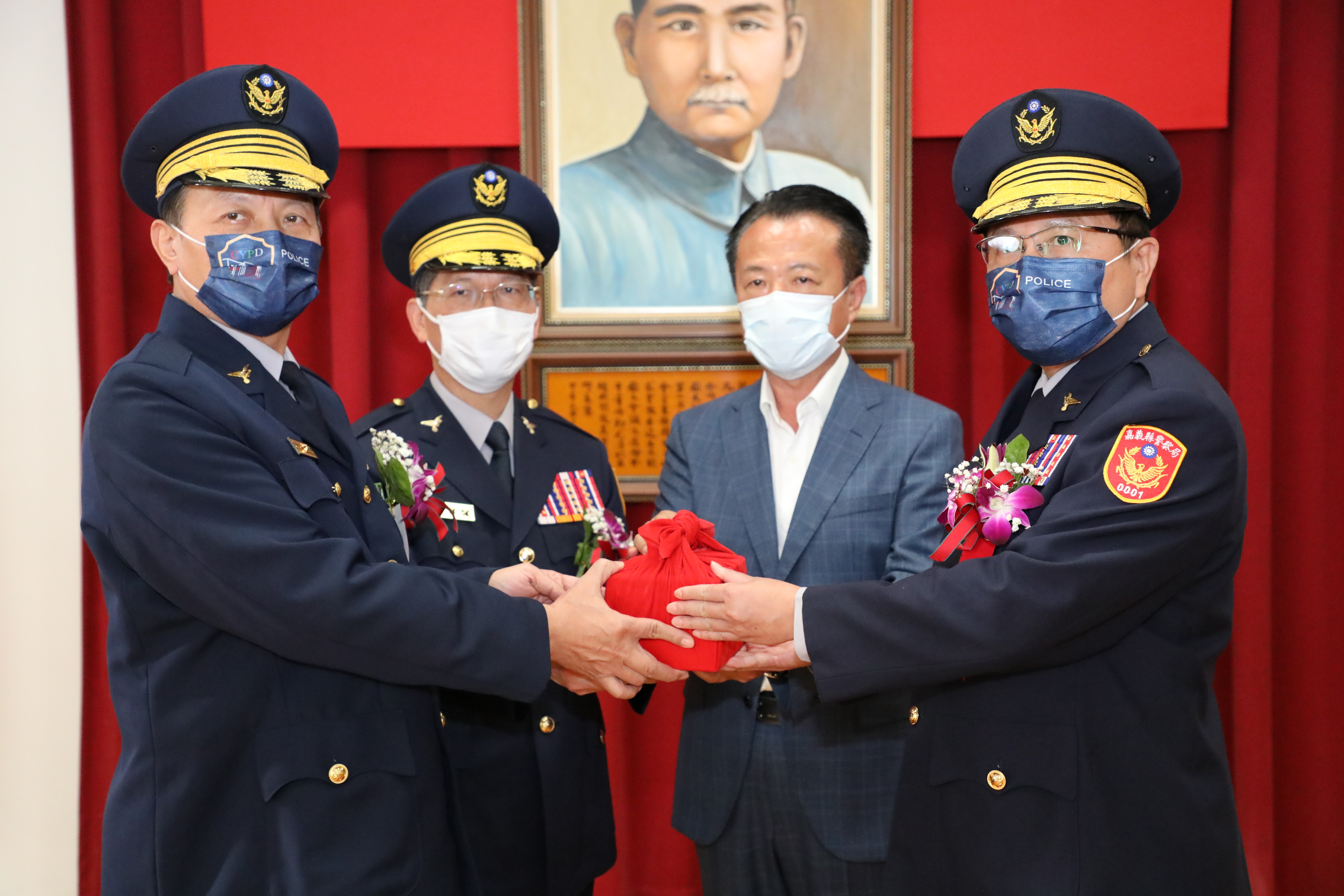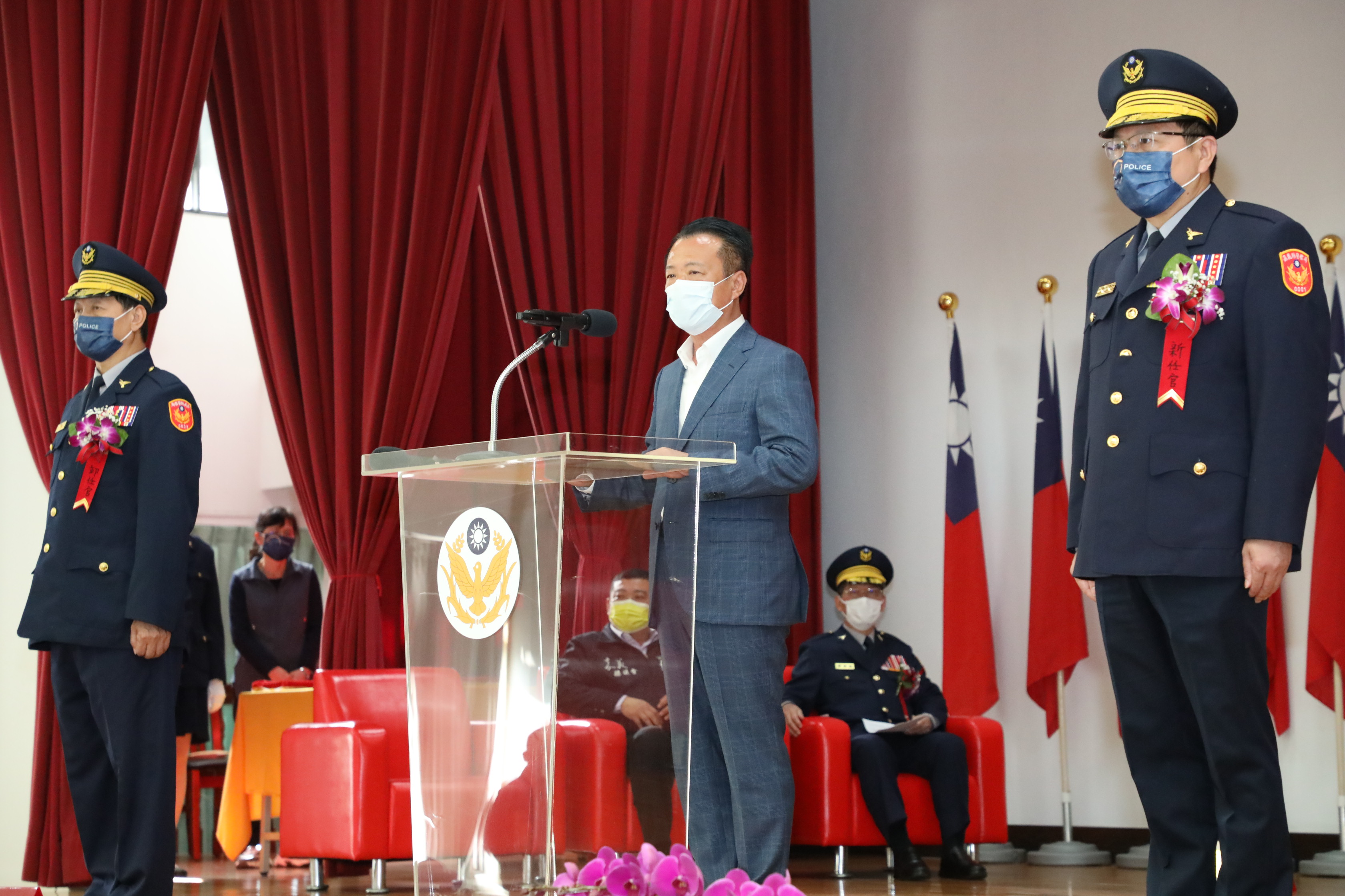 縣長翁章梁(中)感謝局長廖訓誠(左)任內對治安的貢獻,期勉新任局長陳明君(右)「把竊盜案當大案辦」,「刑事案件最快速度偵破」。