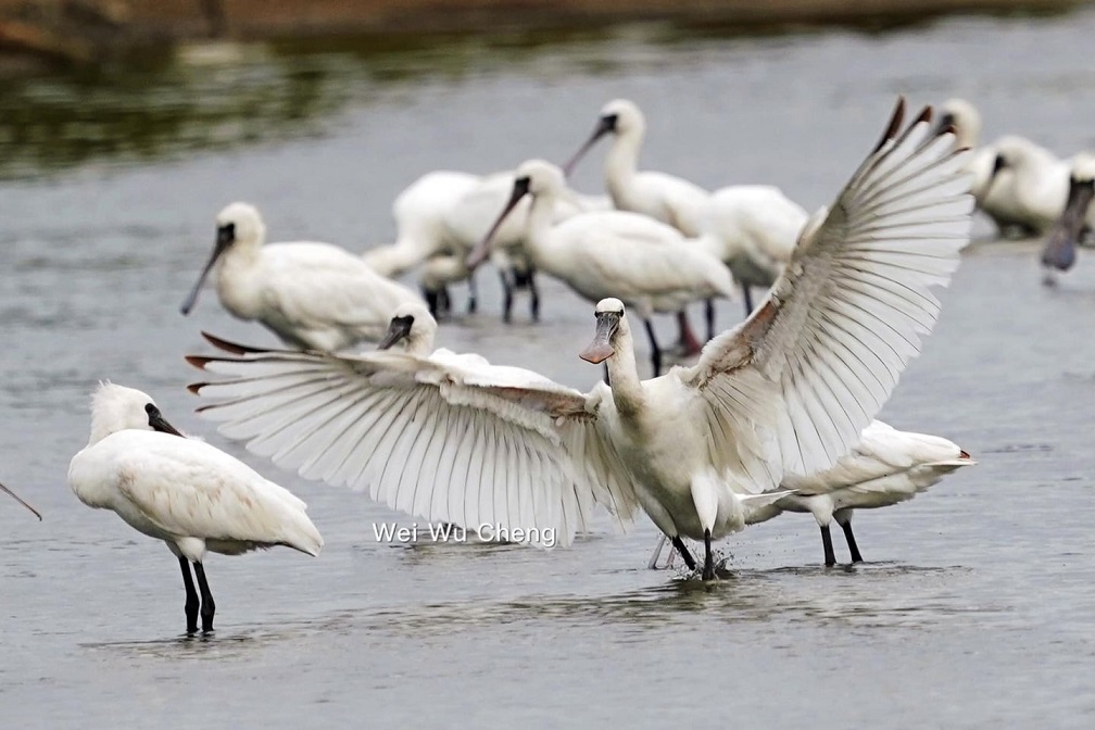 今年很特別,跟黑面琵鷺來台灣的白面琵鷺數量增加不少,這些白面琵鷺會混在黑面琵鷺群裡面(圖中展翅者),只要稍加注意觀察不難發現。