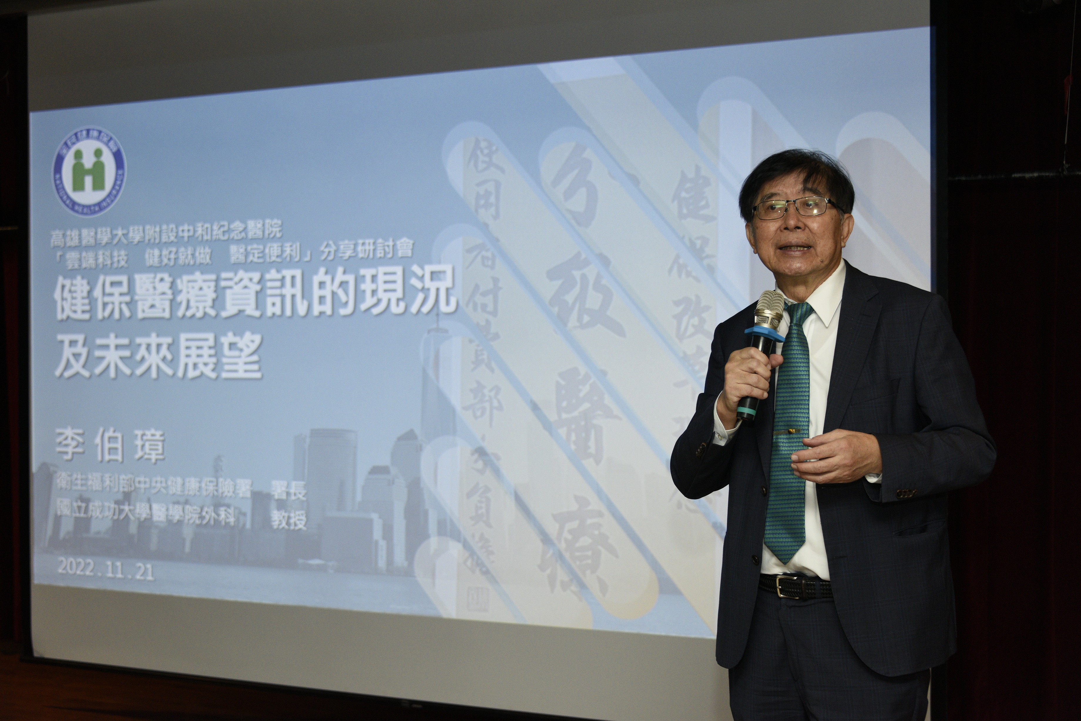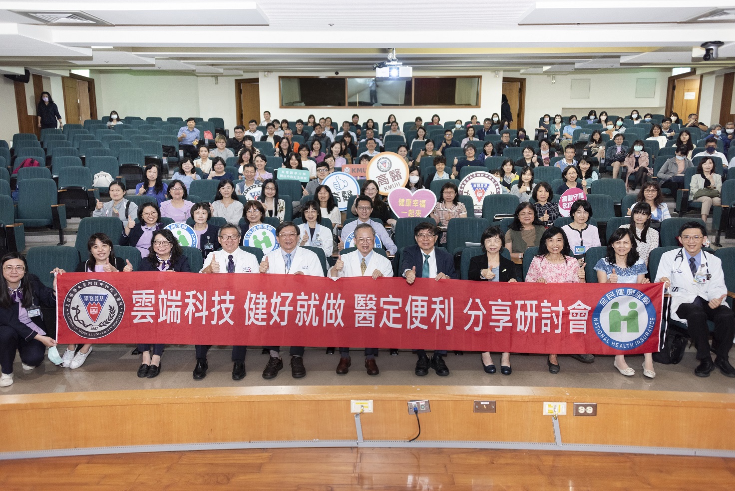 高醫今(21)日與健保署於高醫啟川大樓6樓共同辦理「雲端科技 健保就做 『醫』定便利」分享研討會,由高醫大附設中和紀念醫院院長鍾飲文主持,健保署署長李伯璋在高屏業務組組長林淑華的陪同下,親自南下說明這健保新政策,高屏地區逾45家各層級醫療院所、約150人參與。