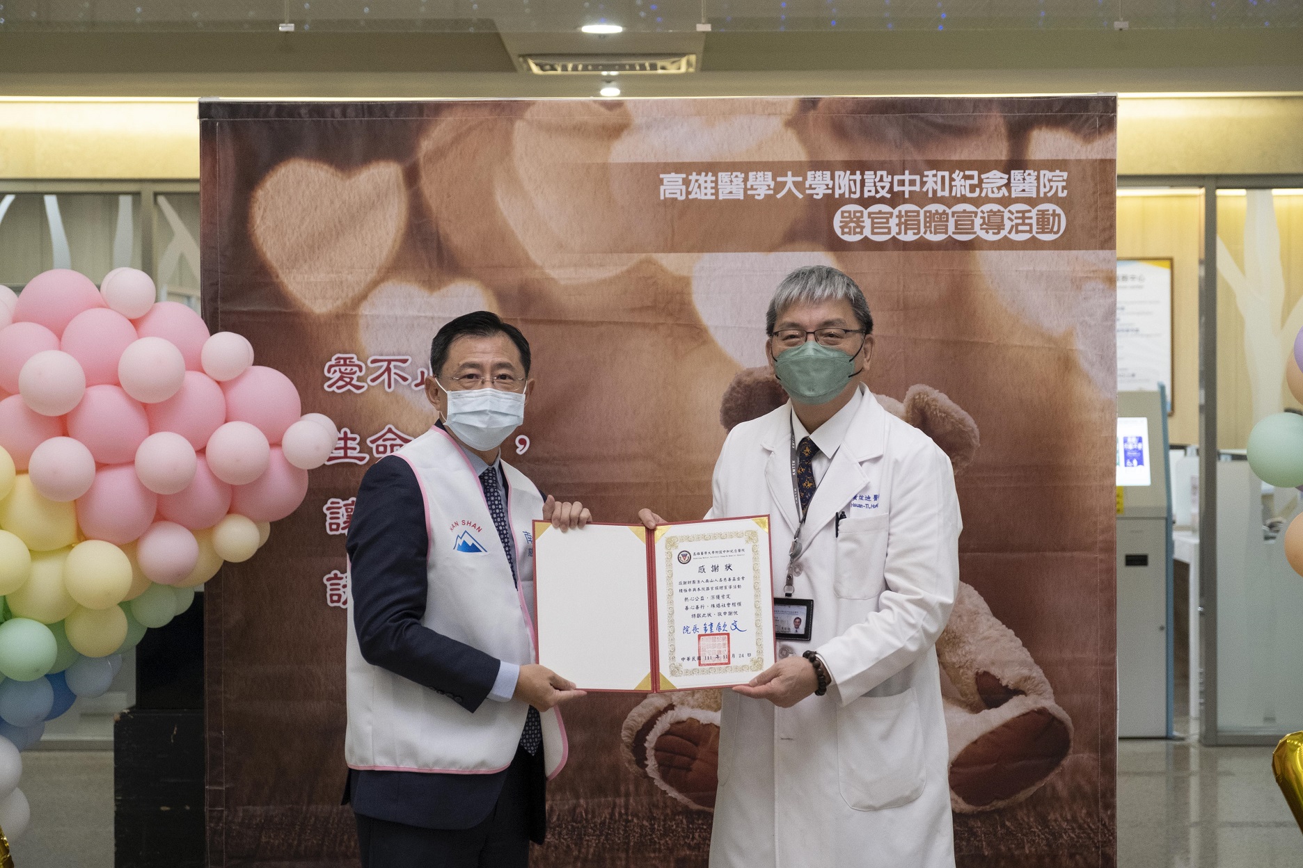 高醫附設中和紀念醫院副院長黃炫迪(右)表示,高醫今年榮獲衛生福利部表揚第15屆優秀器官勸募機構第一類器官捐贈人數第二名、第二類器官捐贈人數第四名、健保卡器捐意願註記第四名,表示高醫身為移植醫學中心,肩負器官捐贈移植觀念教育及宣導任務,透過這些年的努力,獲得政府的肯定。另一方面有越來越多民眾透過宣導認識器官捐贈的生命意義,進而如黃女士般,願意和家人分享生命意義與捐贈意願,能夠成就助人心意。
