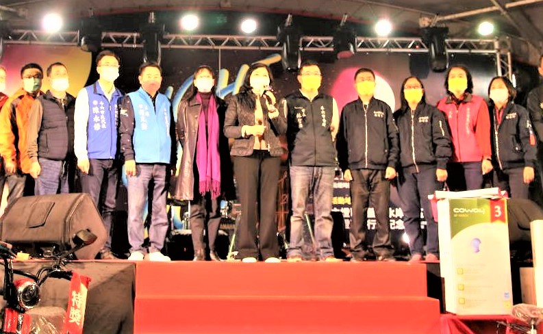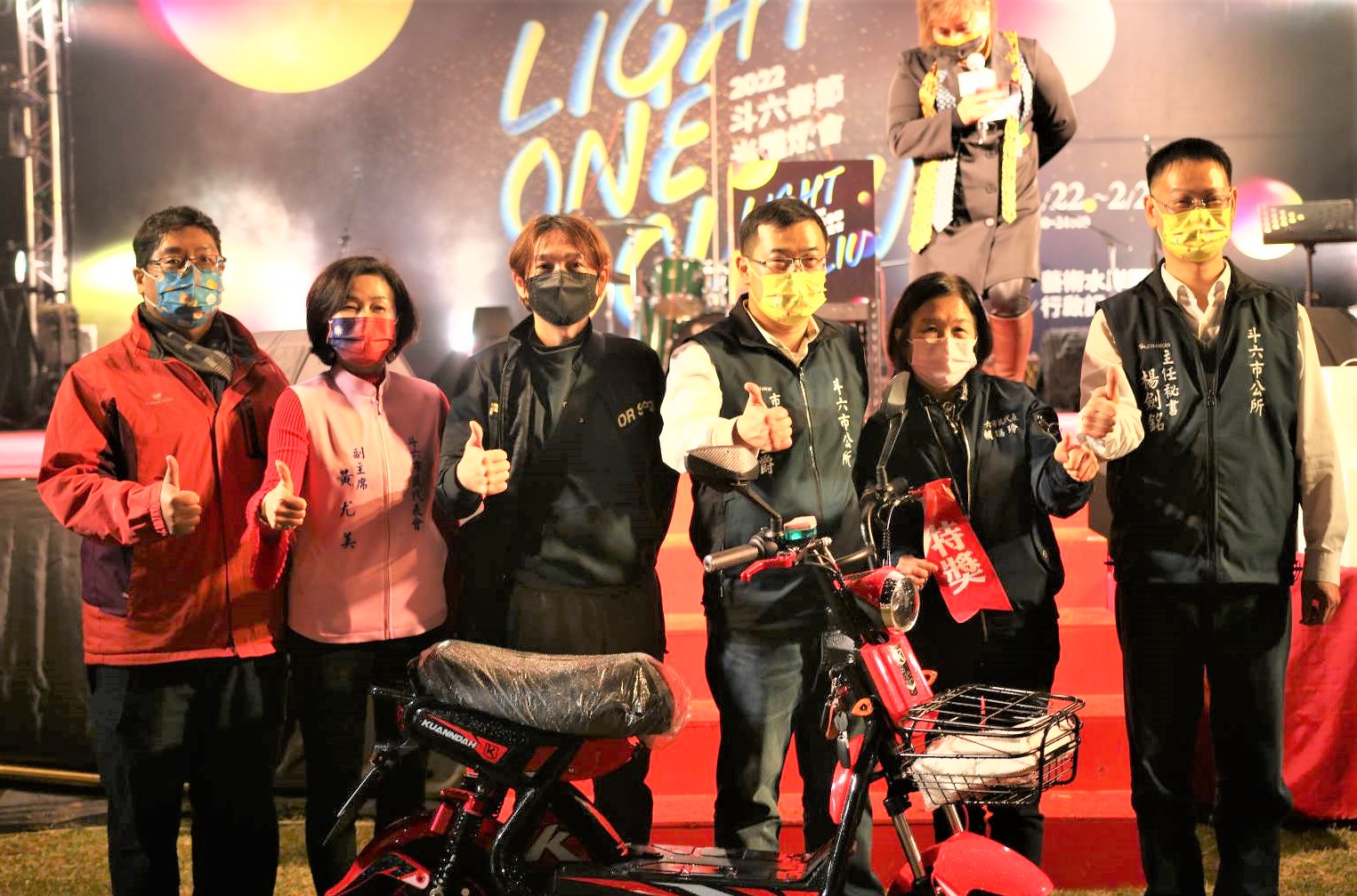斗六燈會點燈晚會進行歡樂摸彩活動,市長林聖爵(右3)等人恭喜抽中電動機車幸運者。