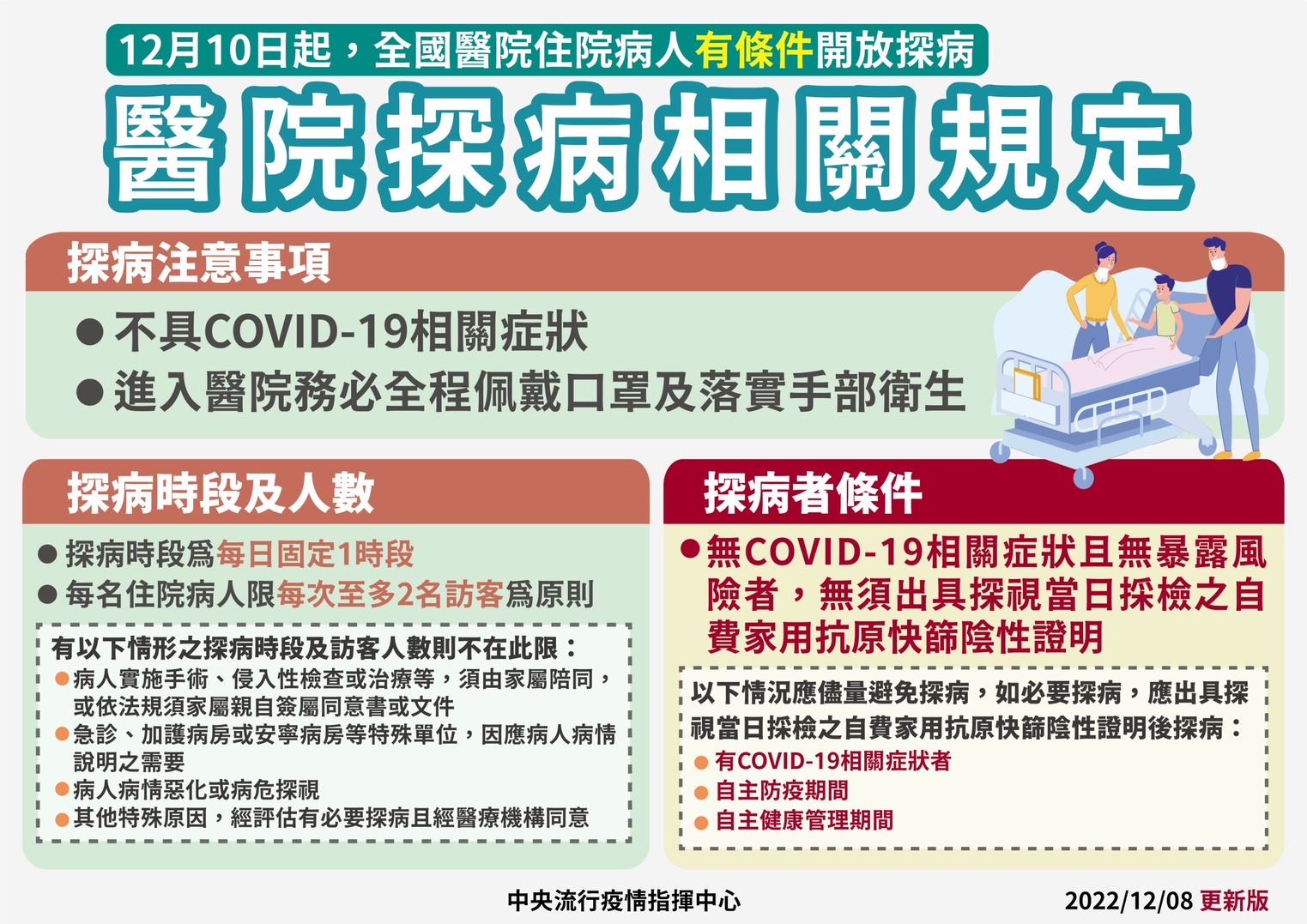 中央流行疫情指揮中心昨(8)日公告自12月10日起有條件開放全國醫院住院病人探病,探病時段為每日固定1時段,每名住院病人每次至多2名訪客為限,如有實施手術、侵入性檢查或治療、急診、加護病房或安寧病房等單位、病人病情惡化或病危探視等特殊原因,經評估有探病必要且經醫療機構同意,探病時段及訪客則依醫院規定。