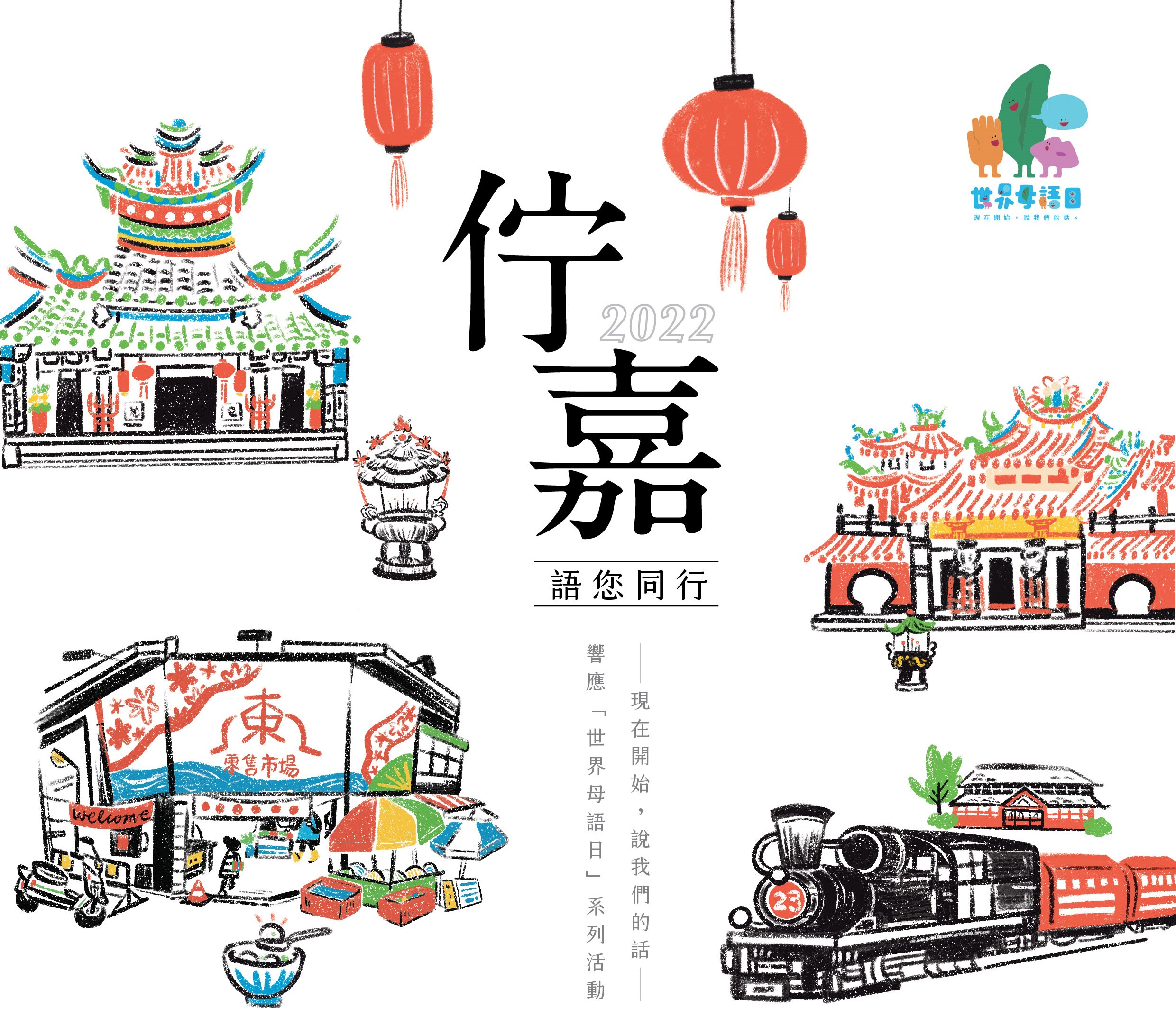 市府今年度配合教育部推動世界母語日活動,由文化局特別規劃〈佇嘉.語您同行〉系列活動,內容包含「語您同行─來嘉行春」,共策辦4條走讀動線,以「來踅百年東市場」、「廟宇行香&踅街看建築」、「嘉義囡仔ê 七桃物仔—阿里山小火車主題遊程」及「好客,過嘉來尞─客庄巡禮」。