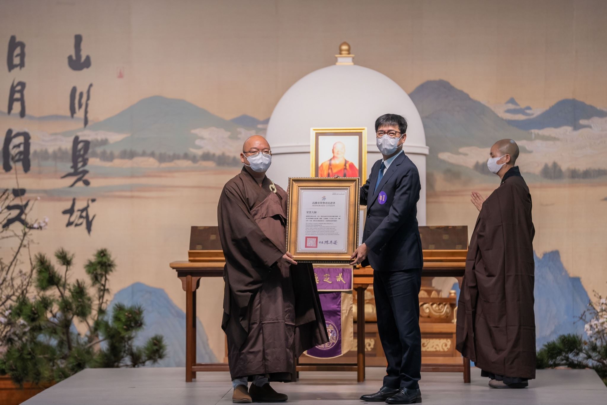 市長陳其邁親自頒發高雄榮譽市民證書,表揚星雲大師以文化弘揚佛法、以教育培養人才、以福利照拂社會、以共修淨化人心,終身提倡人間佛教,在文化、教育、慈善事業皆獲得舉世敬重,可謂高雄的榮耀。