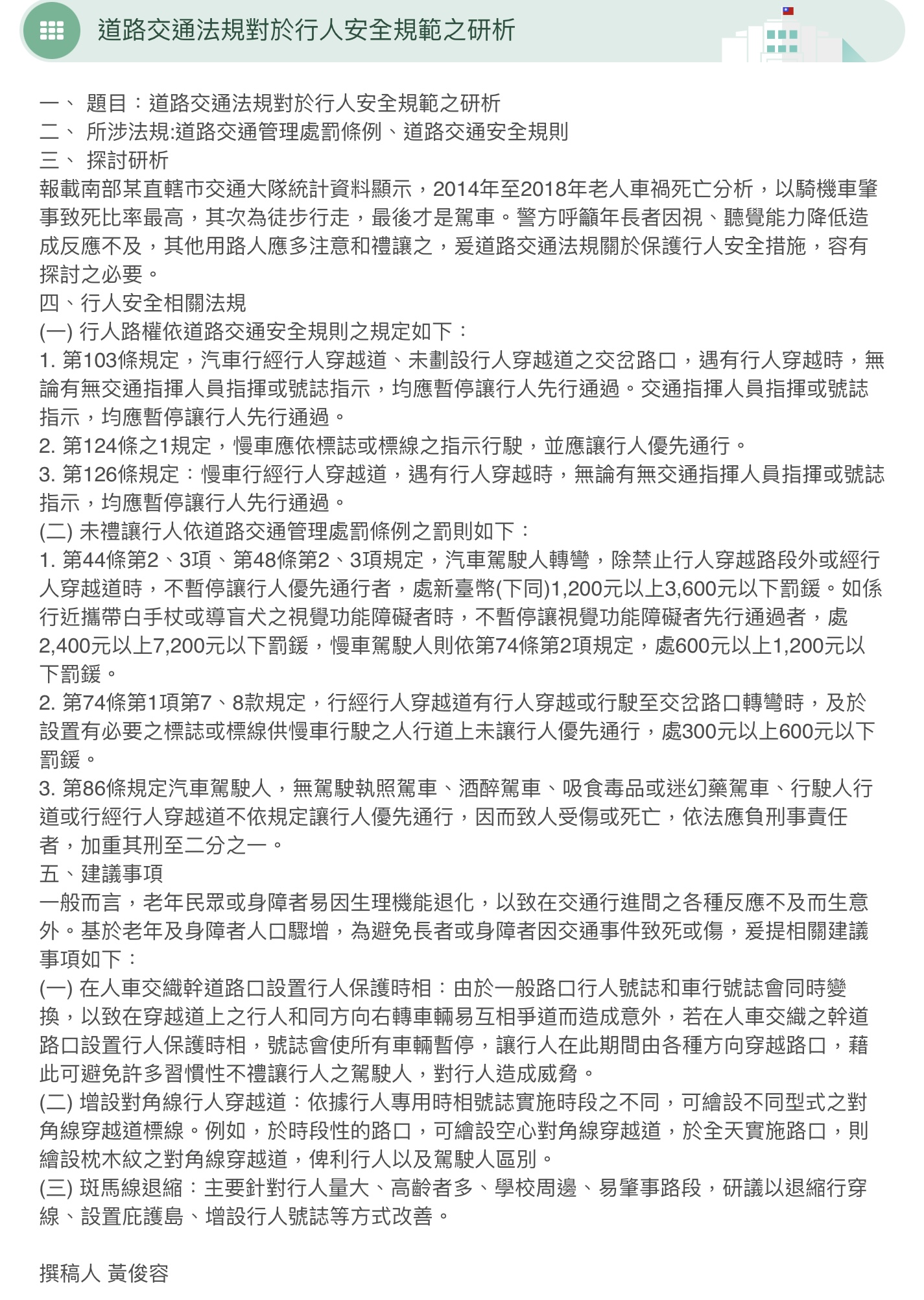 1、雖然約在二十年多前我國道路交通安全相關法規才開始修法注意行人交通安全問題。然而行人不守法規:闖紅燈、不走人行道、橫跨道路、邊走邊看手機、等都是關鍵問題。