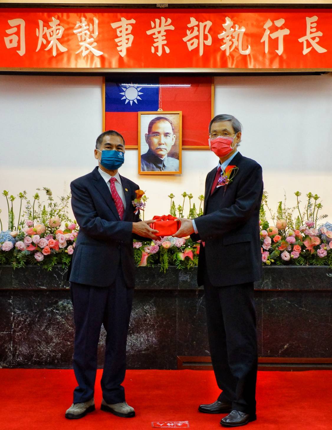 中油煉製事業部副執行長辛繼勤(左)從代理董事長手中接下執行長印信