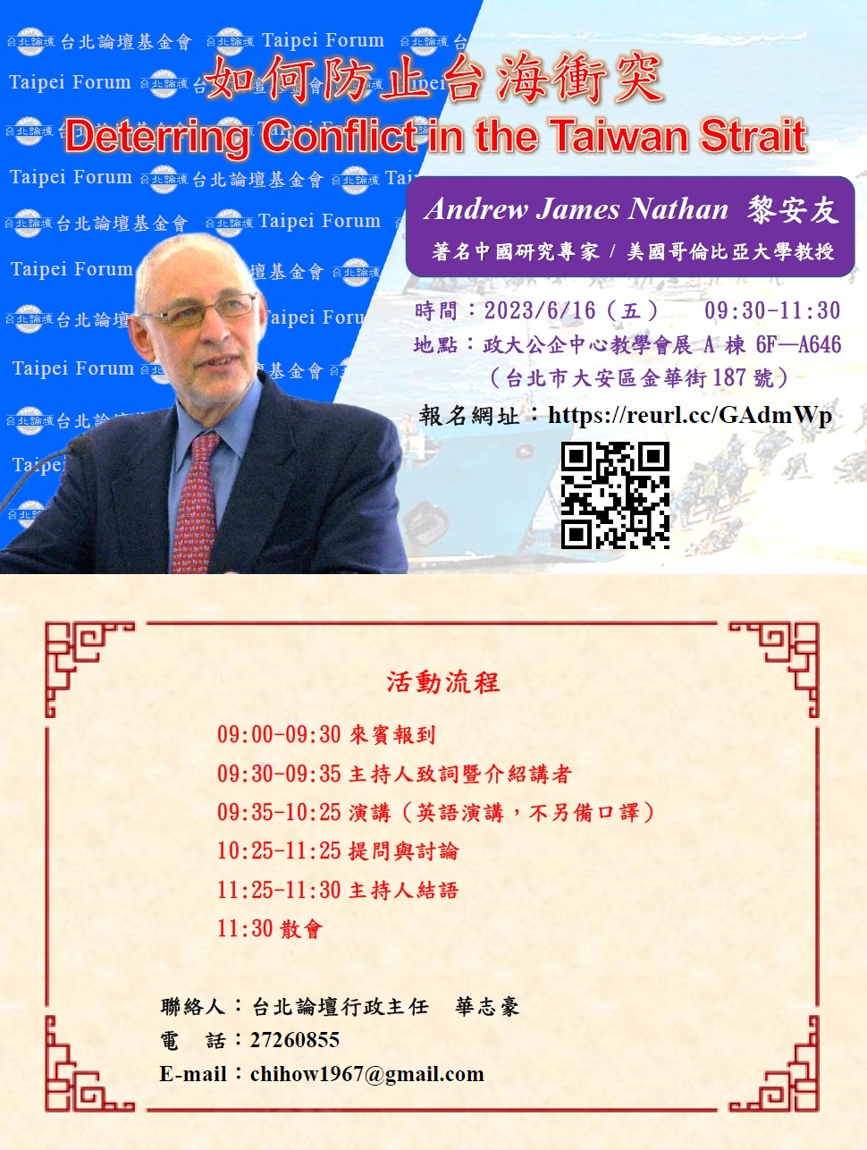 台北論壇邀請著名中國研究專家、美國哥倫比亞大學教授Andrew James Nathan(黎安友)博士 以〈Deterring Conflict in the Taiwan Strait〉(如何防止台海衝突)為題發表演說。
