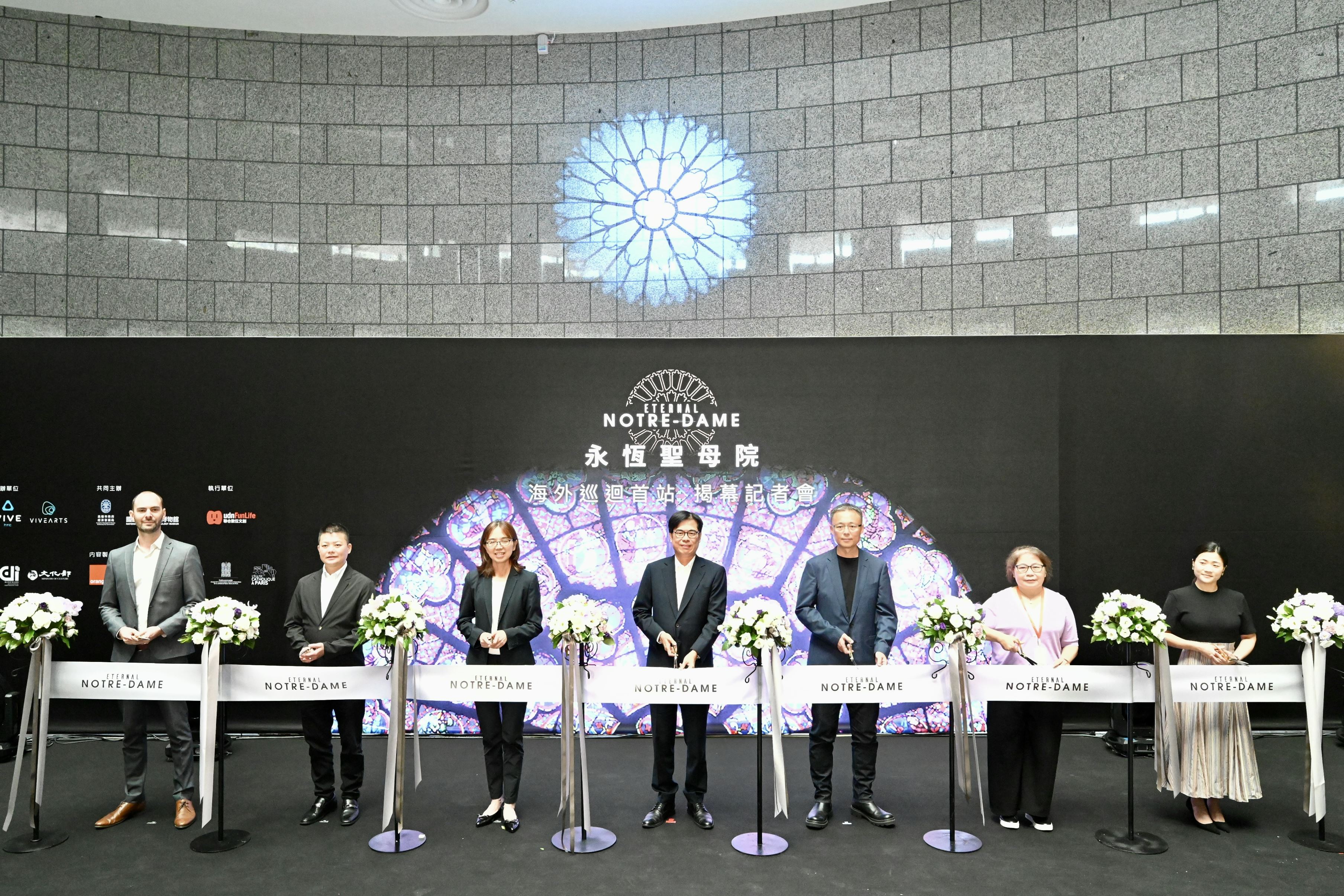 《永恆聖母院-穿越時空沉浸式VR之旅》世界巡迴首站就在高雄,市長陳其邁今(24)日與HTC黃昭穎資深副總裁、法國網紅酷、VIVE Arts葉心宇總監,以及法國Emissive CEO Fabien Barati共同出席揭幕記者會,並於剪綵後穿戴裝置,跨越時空搶先體驗聖母院今昔各種景色。
