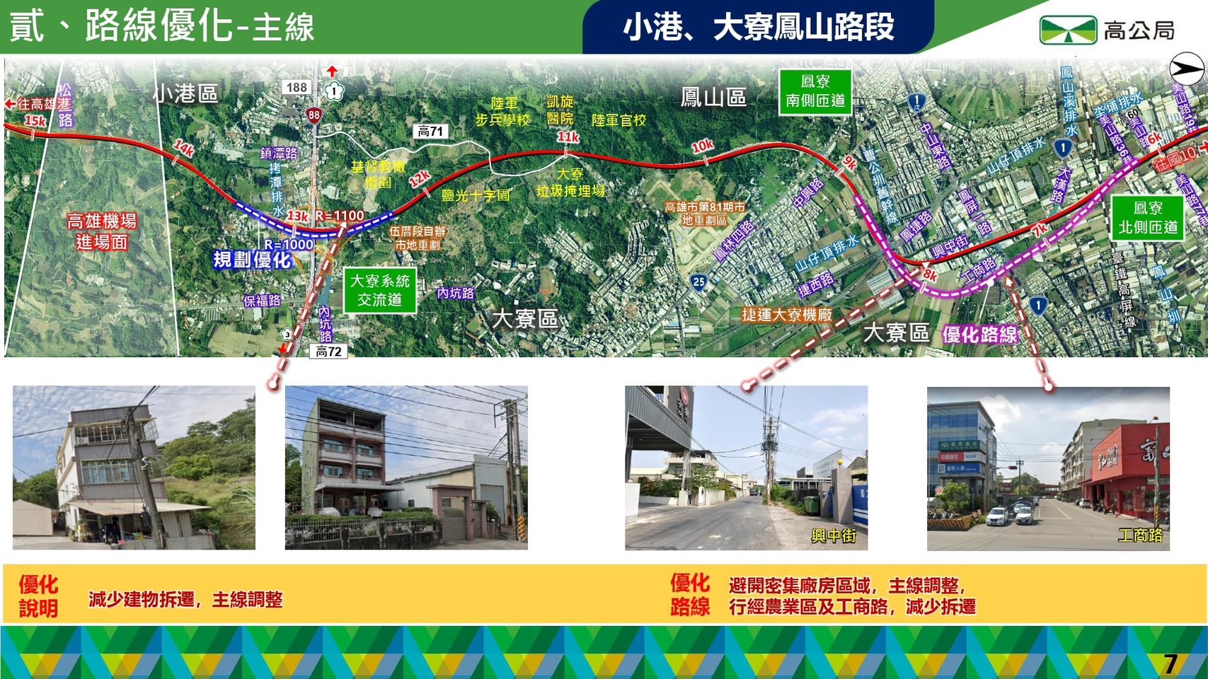 規劃開發國道七號的顧問公司設計之初就沒有到高雄了解環境,只是拿著地圖大筆一劃就定路線,南下開會時才發現路線有石化工廠而修正,召開公聽會時就有地主指責顧問公司只為了賺錢,開發單位不顧環境、地方發展便宜行事,世新大學調查時,就有地主反映應本良心做事,不要替開發單位和顧問公司的過失背書,反對聲音從開始一直不斷,還動員陳情總統府,但開發單位還是一意孤行。