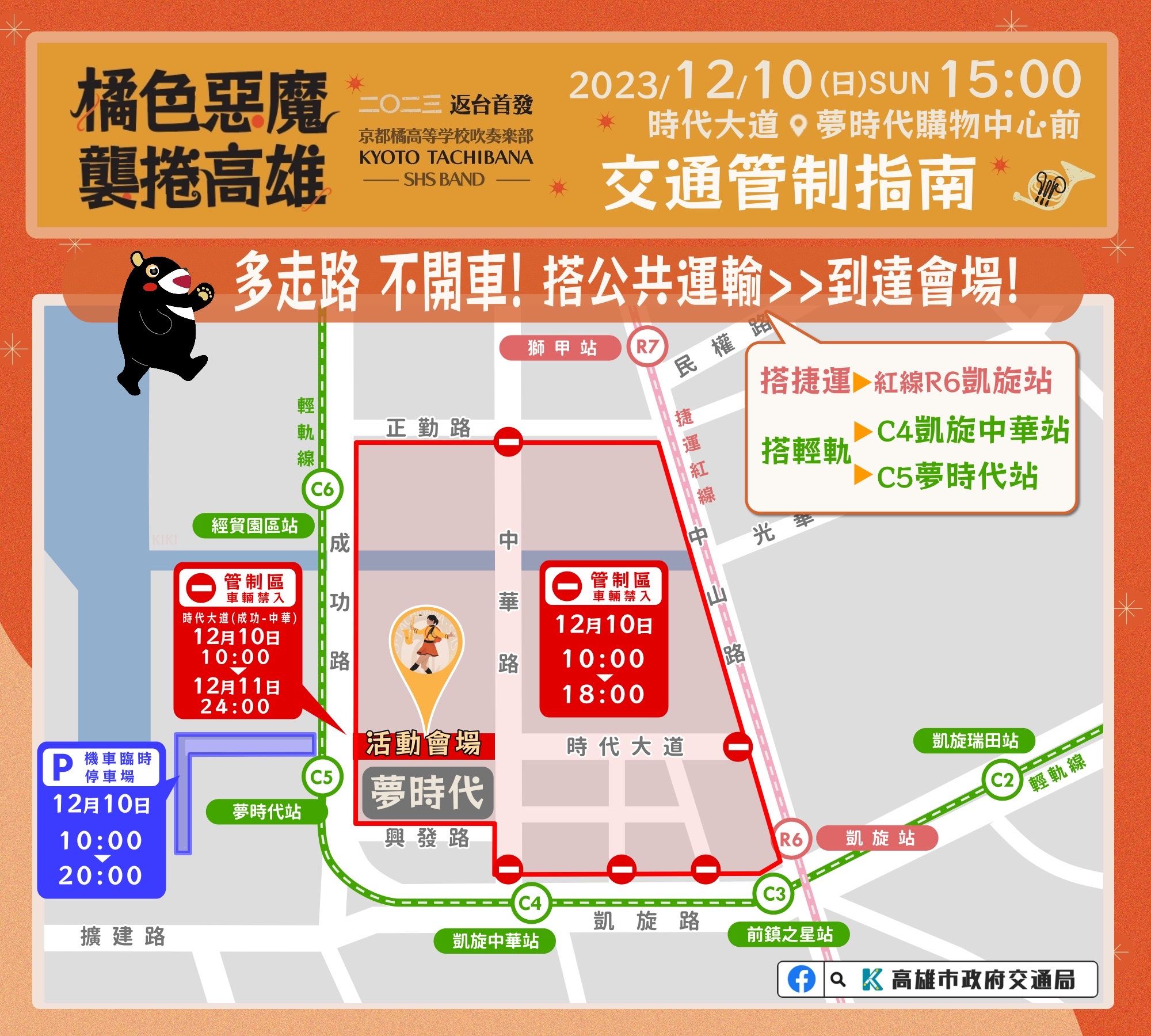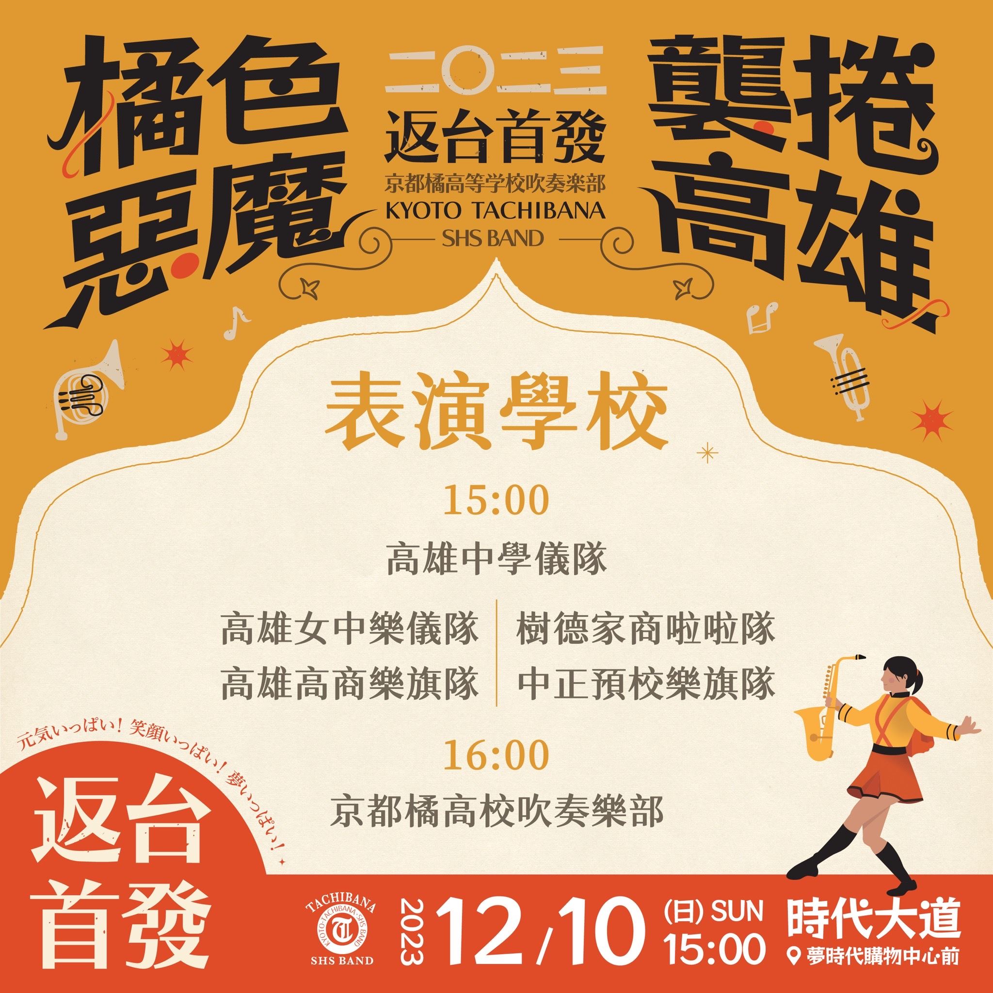 「橘色惡魔」日本京都橘高校吹奏樂部與高雄五所高中職12月10日將在高雄演出,時代大道周邊進行交通管制,高雄市政府呼籲民眾搭乘捷運、步行前往現場。因應民眾熱情迴響,高雄市政府將在活動現場設置「同步直播區」架設500吋大型螢幕,也在網路平台同步進行多元視角直播。市政府特別設計「橘色惡魔襲捲高雄」主視覺應援手幅,提供民眾自行列印。