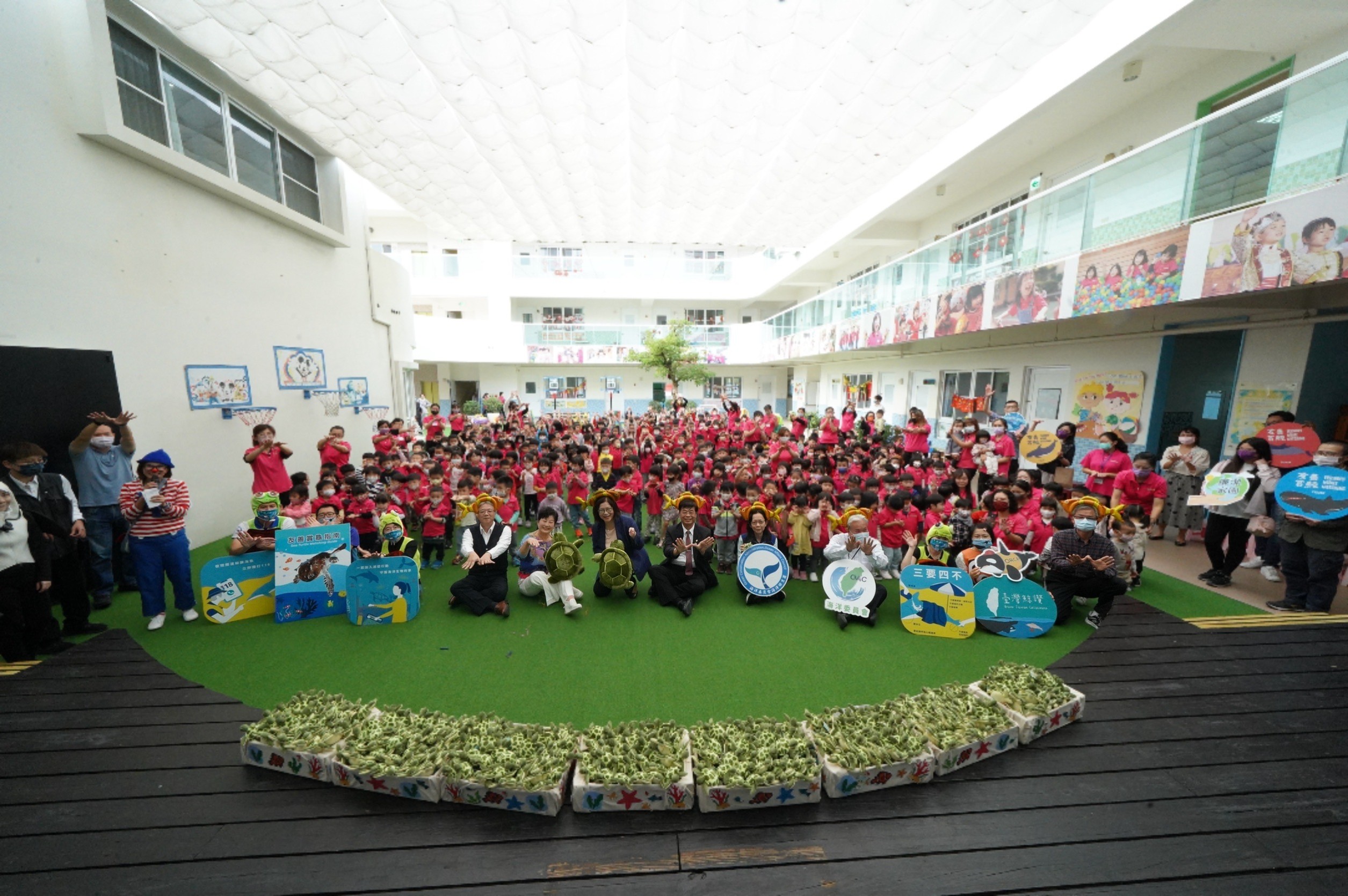 海洋委員會舉辦新建辦公廳舍敦親睦鄰「管媽海洋童樂會」,今(5)日於未來的鄰居-高雄市私立華頓中都幼兒園熱鬧舉行,邀請海洋廉政繪本《小海龜的逆襲》、《臺灣鯨讚》作者楊婉怡,扮演小丑魚姊姊帶領現場超過300位大、小朋友跳起「海龜舞」及「搖滾虎鯨」,海委會主任委員管碧玲也親自上台帶動,熱舞同歡,還現場開設「海洋保育知識小學堂」,答對問題的小朋可以拿到總統府賀歲紅包,另外也準備了海洋廉政繪本、友善海龜指南送給在場的小朋友,讓海洋保育從小扎根,深化海洋意識。