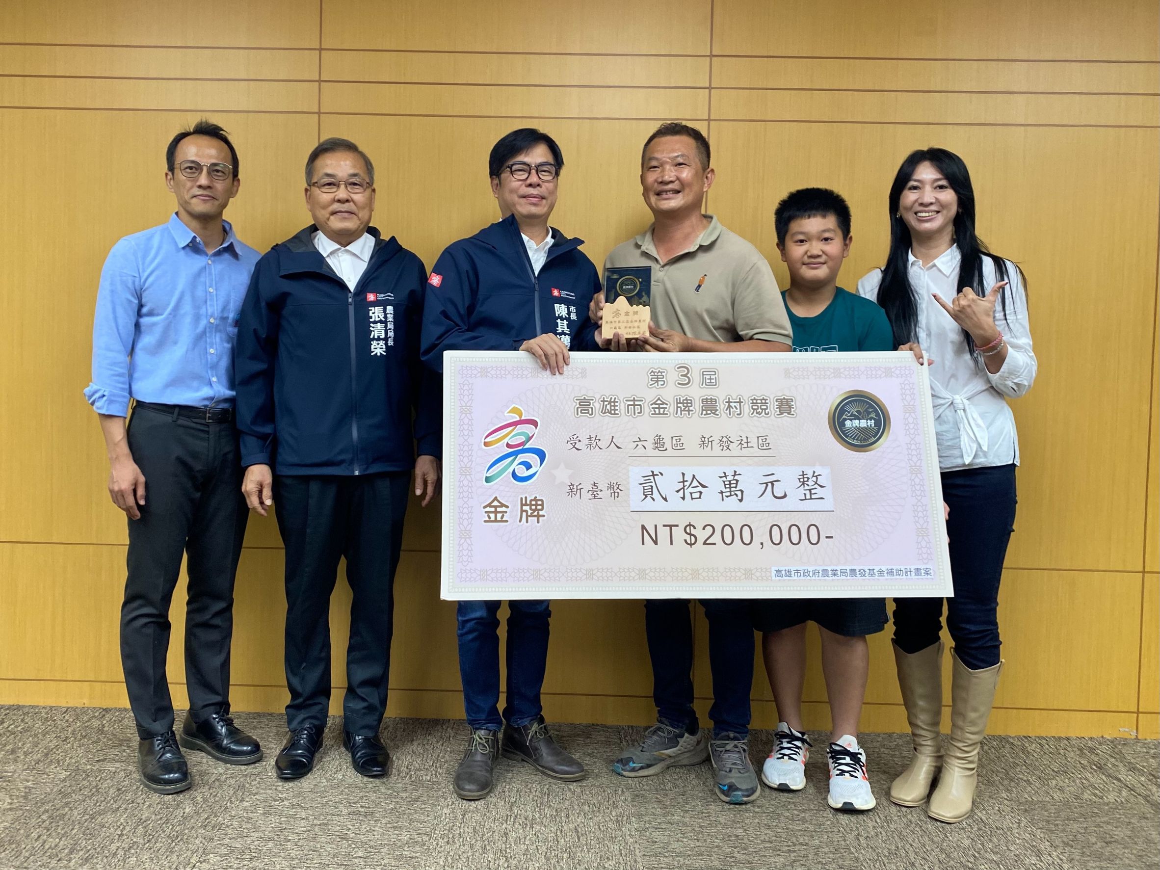 三年一次的金牌農村競賽,高雄市由六龜區新發社區及旗山區糖廠社區榮獲金牌勝出,市府今(6)日舉辦頒獎,市長陳其邁恭喜獲獎之農村社區,並期許代表高雄參加全國決賽的新發、糖廠社區,做好準備為高雄再次奪得全國金牌。