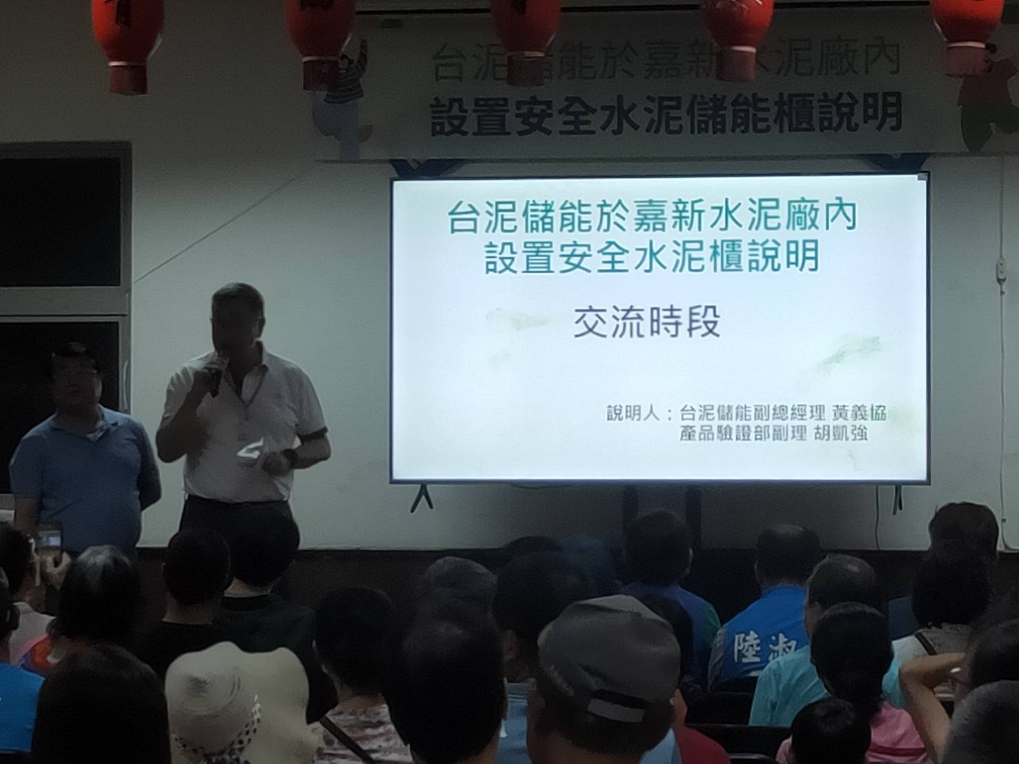 里民質疑火災時如何處理?綠化工程做了多少?開發單位台灣水泥公司張安平董事長除在現場聆聽里民意見外,並親自上台一一回答里民問題,台泥在全世界造了二兆瓩儲能,目前都非常安全!有15項全世界專利的「安全性」。強調電池是不會排氣、沒有高熱、極輕微電磁波!萬一發生意外也不會傷及第三者,綠化問題將由地主嘉新水泥規劃。