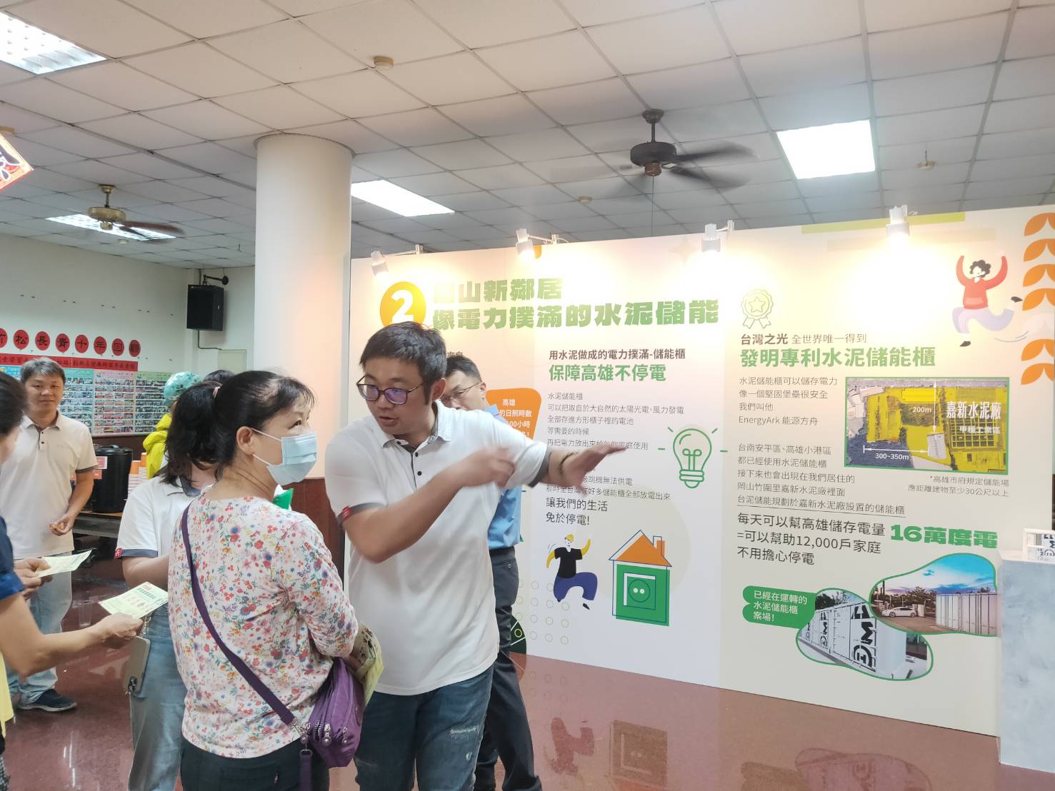 台灣水泥公司表示,台泥儲能專業團隊選擇在竹園里里民日與附近里民面對面交流,相關説明指出,高雄發展太陽光電需要電力撲滿(儲能),地震時才不會停電,並強調本案採取最安全可靠的水泥儲能櫃,櫃體設有三道強大的防火武器,櫃版強度是101大樓的1.8倍,這種安全可靠、先進的設計是台泥的研發成果,並邀請當地的里民重力敲打儲能櫃的水泥版面,體驗結構強度。會場還設有體驗區,讓里民體驗使用鋰電池、馬力超強的電動車、電動越野車。