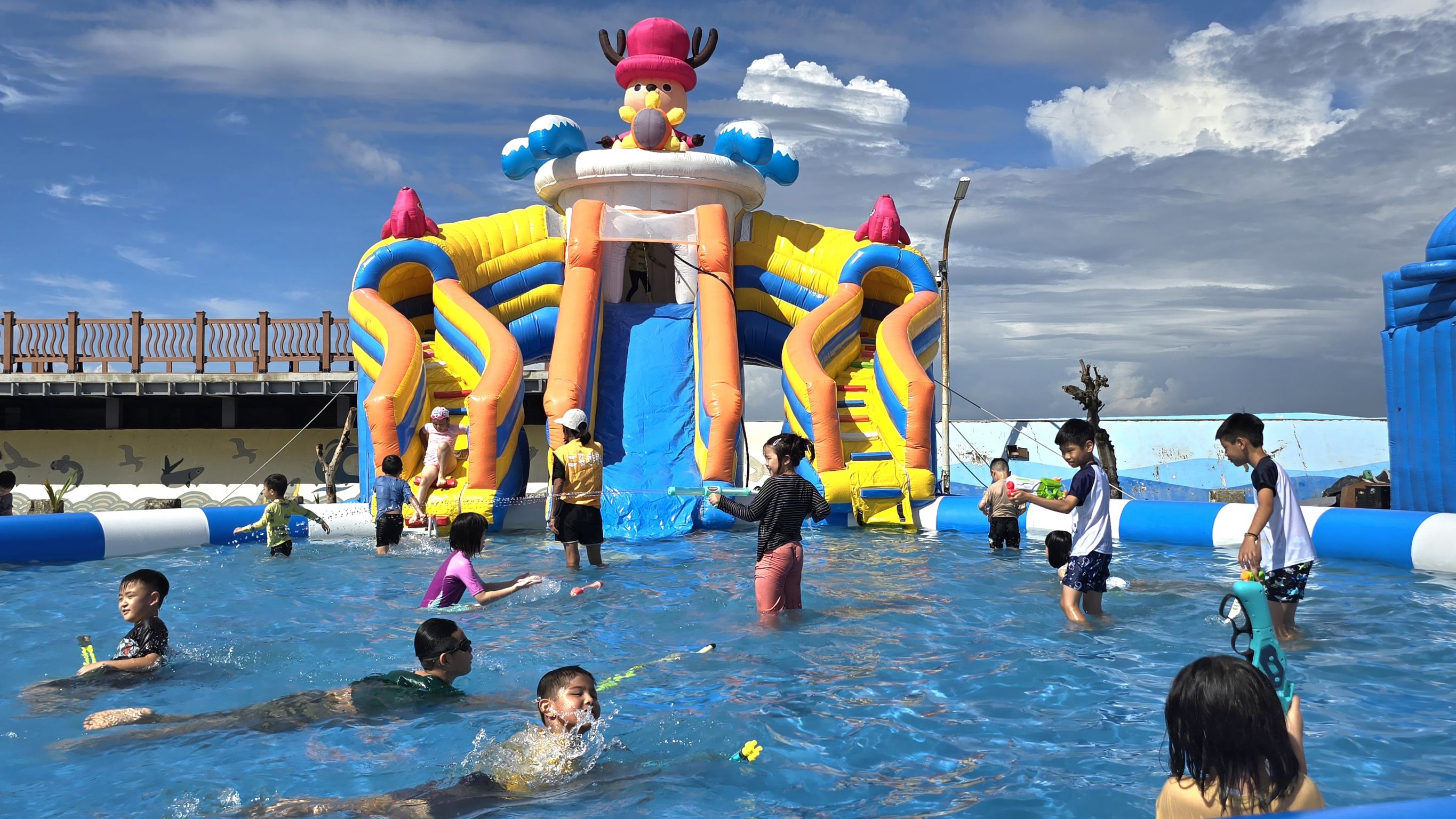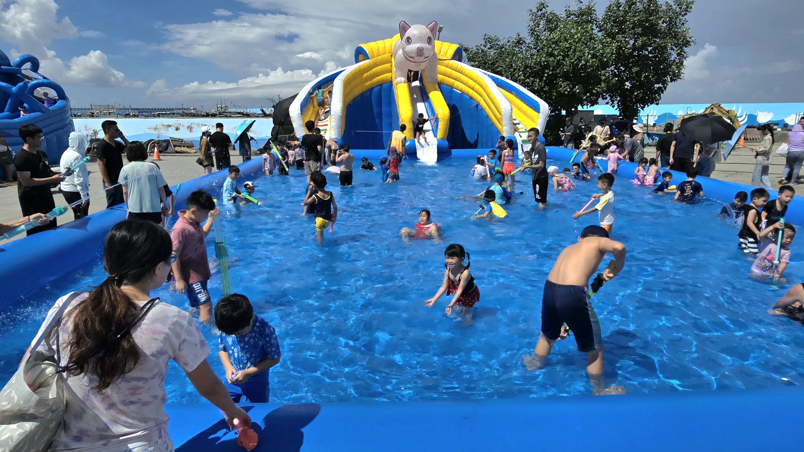 活動現場設置三座不同規格的水樂園,分別針對幼兒、兒童和青少年設計,滿足不同年齡層的需求。水樂園內設有溜滑梯及水槍等各種遊樂設施,讓孩子們在水花四濺中歡笑不斷,家長們也紛紛加入,共享親子時光。