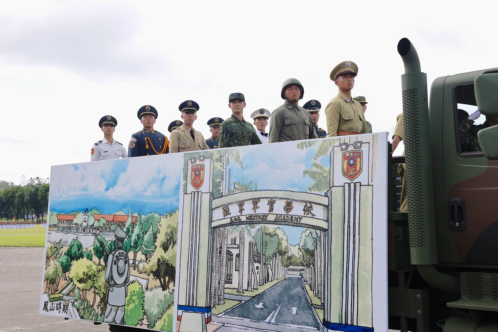 校慶典禮由三軍統帥賴清德總統親臨主持,首先校 閱地面部隊,接續分列式則以陸官軍樂隊為首、並由巨 幅國旗隊、陸官「黃埔、南京、成都、鳳山」等四時期 服飾展車隊、傑出校友、校友連、聯合校旗隊、國外友 校校旗隊及各校學生連之順序通過司令臺,展現「承先 啟後、薪火相傳」的時代意義。