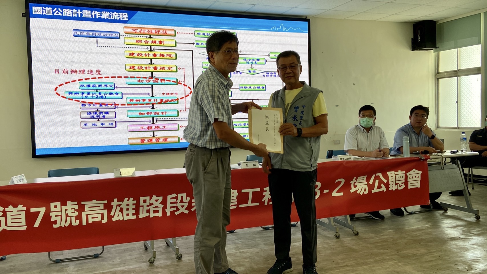 曾承豐先送居民對更改路線的意見詷查書,並詢問高公局副局長陳宏仁退回原規劃路線的可能性,陳宏仁說,正在走程序,完成法定程序會報請交通部核定,居民馬上反映程序不合法如何推動建設,他們完全沒有接到溝通就接到我家門前要建高速路的通知,並指高公局公然說謊。