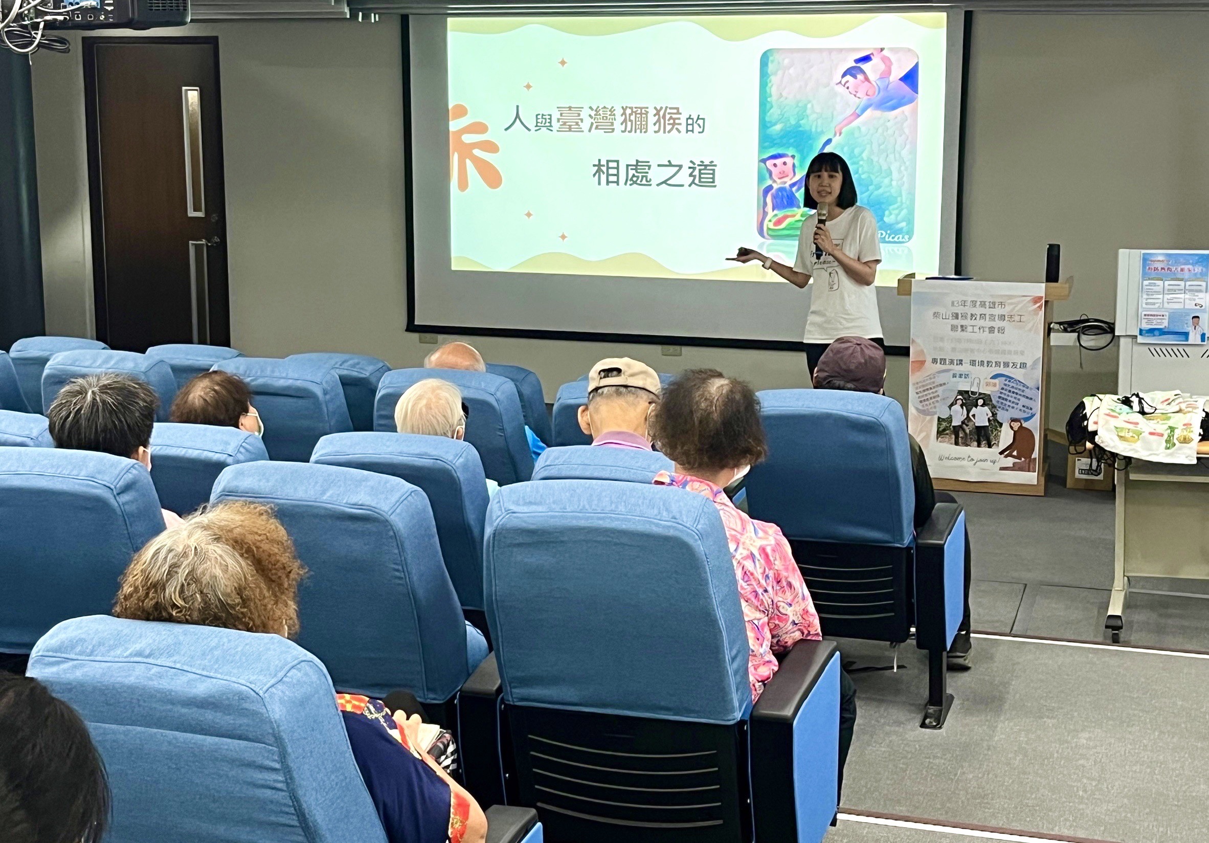 增能課程邀請長期進行環境教育的黃聿訢與郭璿講師,兩位年輕講師皆為野生動物專長人員,並創辦猴友善農業社群,幫助行銷對獼猴友善作為的農產品,讓更多農民願意投入非傷害性的防治作為。課程期間運用設計過的小遊戲讓參與者輕鬆融入教學內容,利用互動加深大家對獼猴飲食多樣性的了解,壽山區域供給獼猴的食物非常豐富多元且不匱乏,完全不用擔心獼猴沒有東西吃,藉此導入獼猴不需要人為額外餵食的觀念;介紹除了定點人力宣導解說外,還有其他推廣核心價值的環境教育作法,如戶外教學、快閃小劇場等;並探討(人類中心主義、生命中心主義與生態中心主義)三種環境倫理的價值觀,鼓勵志工們與他人宣導「獼猴三不」政策時,可多思考不同主義的人在乎的事情,經換位思考後從各自在乎的價值點出發,使溝通能位於同一條線上進行雙向交流。