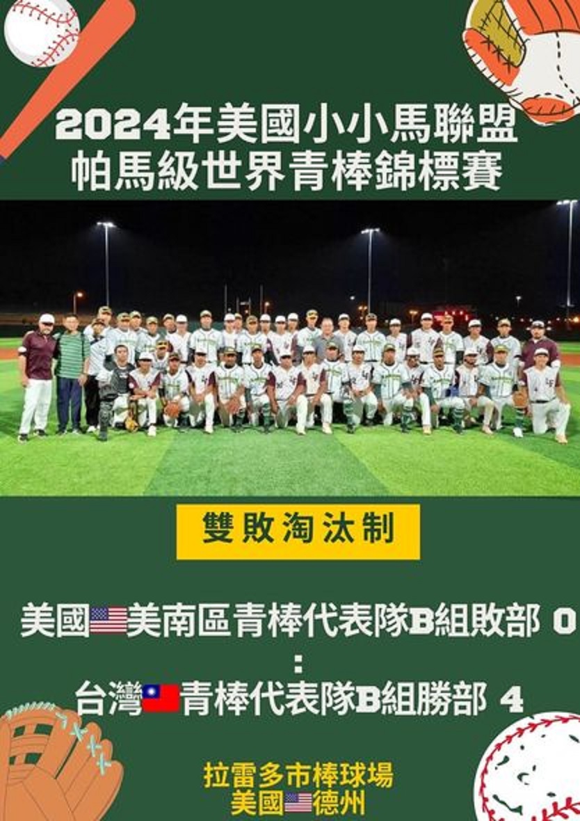 由前內政部長余政憲領軍的台灣青棒代表隊,第二場比賽對上德州青棒代表隊,6:4有驚無險贏得第二場,28日晚上再接再厲,台灣青棒代表隊大勝美南區青棒代表隊或德州區青棒代表隊。