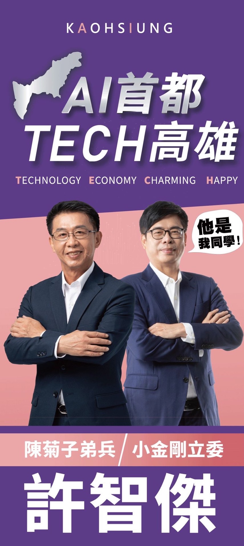 許智傑說,將陸續會掛起4、50塊競選看板,競選口號「AI首都TECH高雄」,他與陳其邁是高中同學,其中一個看板有使用陳其邁照片。許智傑表態爭取市長提名後,展現積極企圖心,臉書粉專迅速換上同框陳其邁封面相片與大頭貼,也有人分享今日下午已接獲許智傑發送的爭取黨內初選簡訊。