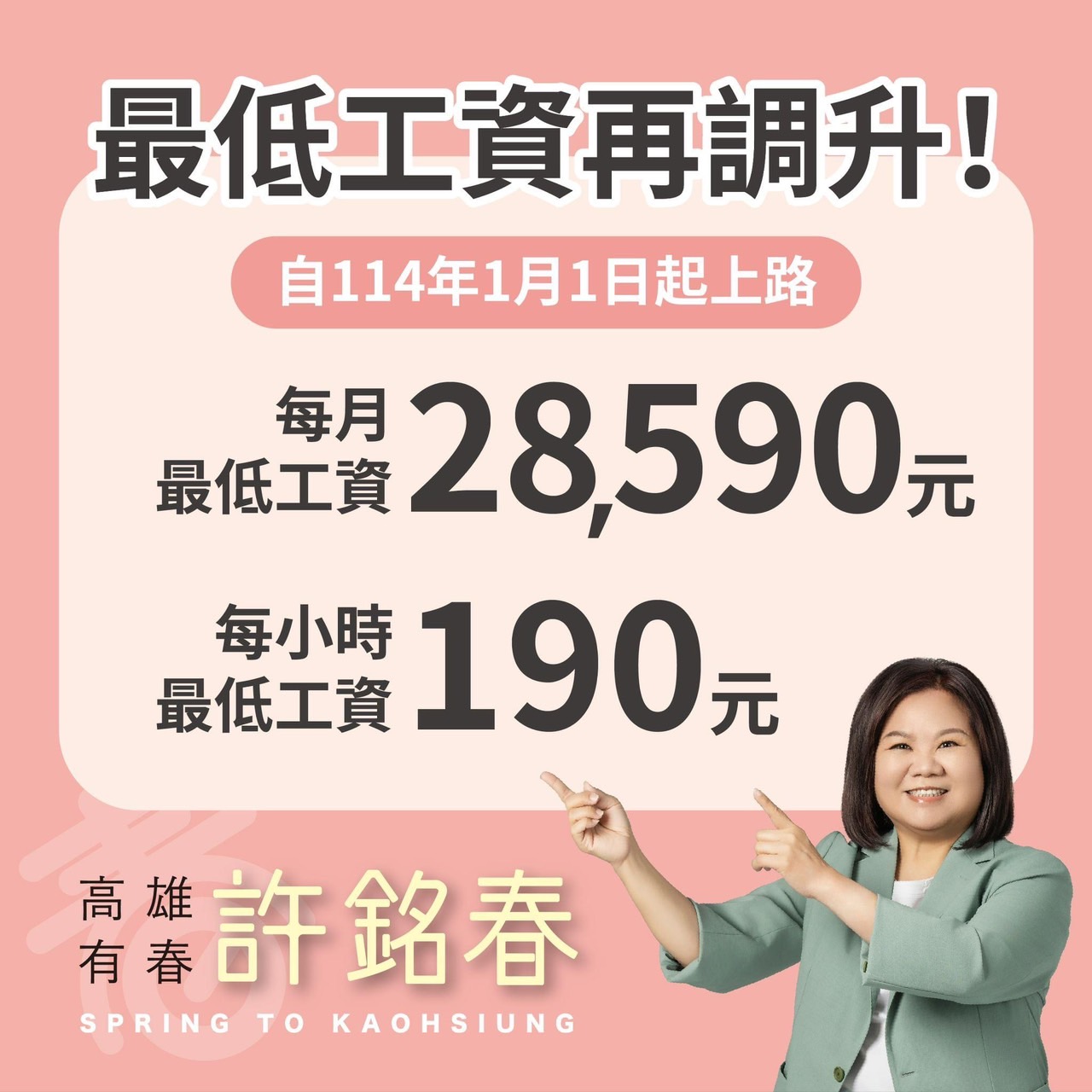 前勞動部長許銘春在任內完成倡議多年的《最低工資法》立法程序,今年實施第一年。勞動部在今(4)日召開最低工資審議委員會並且做成決議,自114年1月1日起每月最低工資調至28590元,每小時最低工資調至 190元。對此,許銘春表示,她任內年年調漲基本工資,最後讓最低工資法制化,讓勞工經濟生活更有保障,經濟果實勞資共享。