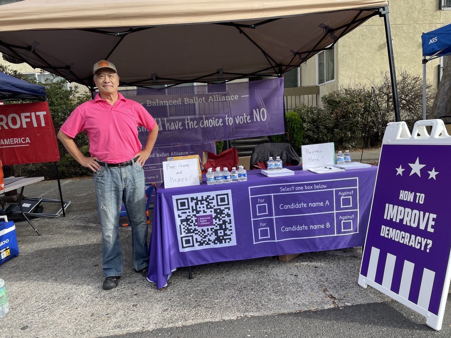 負數票協會前理事長張天鷞於2024.9.8在美國柏克萊擺攤、推廣負數票理念與實務運作