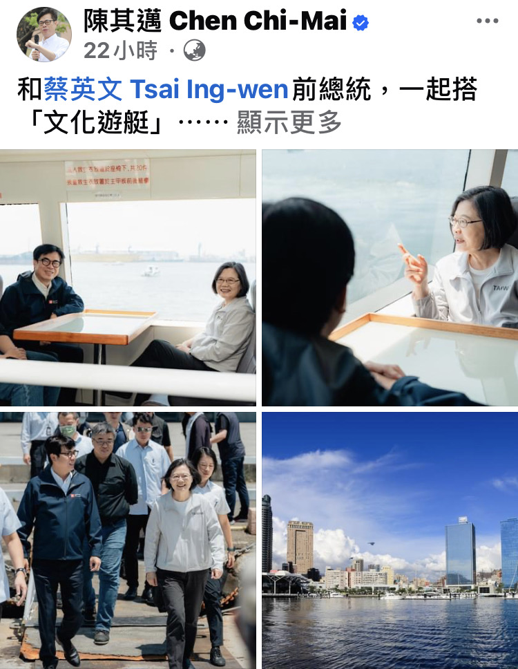 蔡英文公開陳其邁的中秋節行蹤三時後,陳其邁也貼文表示:「和蔡英文 Tsai Ing-wen前總統,一起搭「文化遊艇」。