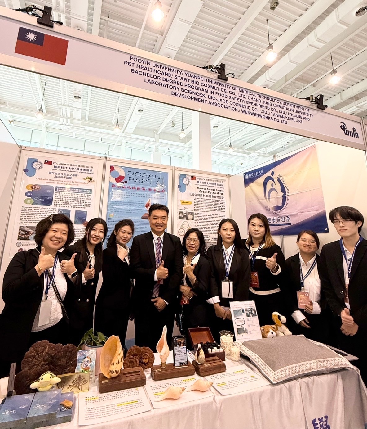 陳中一表示,謝天傑教授與黃曉玲助理教授指導劉宸玲、阮素娟(富新高中畢)同學以「靈芝在生技產品之應用-海洋亮子面膜」;黃曉玲指導楊舒淳(國際商工畢)、劉芯彤(樹人醫專畢)、黃健宏(馬來西亞)以「化妝海綿再利用-綠色寵物坐墊」在2024KIDE高雄國際發明暨設計展勇奪二金。另謝天傑、黃曉玲、張簡雅文(高苑科大畢)師生以「音樂播放擴香儀-海洋之音」再添一面銀牌。
