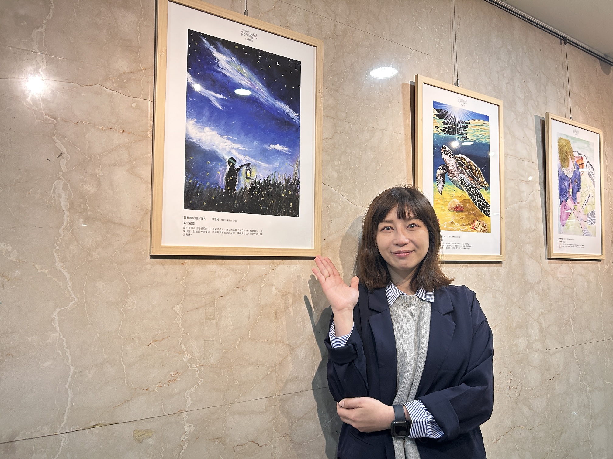 「癌友和家屬在面對困難時,身邊的支持力量就像螢火蟲的點點微光,導引身處黑暗中的他們依然能找到希望,繼續前行!」以《仰望星空》榮獲醫療組佳作的賴淑婷護理師說道,她作為護理師不僅長期照護癌友,還是一位癌友家屬,她深刻體會到癌友與家屬在抗癌過程中無人能分擔的孤獨與無助感。因此,她希望藉由這幅作品,為抗癌中的患者與家屬帶來支持和溫暖。