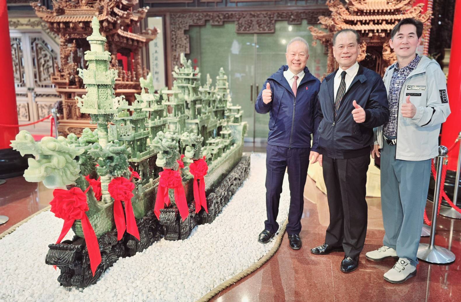 黃明聰議長強調,保安宮是藝術與宗教人文集聚的信仰中心,尤其是哪吒三太子為主神,民間又尊稱中壇元帥、火輪天王等,被經常在外奔波的信眾,或從事運輸行業者視為護身神,當獲悉京典開發董事長鄭楊慶的友人,曾收藏一座長約五公尺、高一公尺餘的玉雕龍船後,咸認民間信仰的哪吒三太子,不僅踩風火輪,更應有龍船護駕,在種種因緣的聚合下,終將曾是同型玉船,並且價值超過千萬元的九龍玉石龍船,安奉在保安宮大殿。