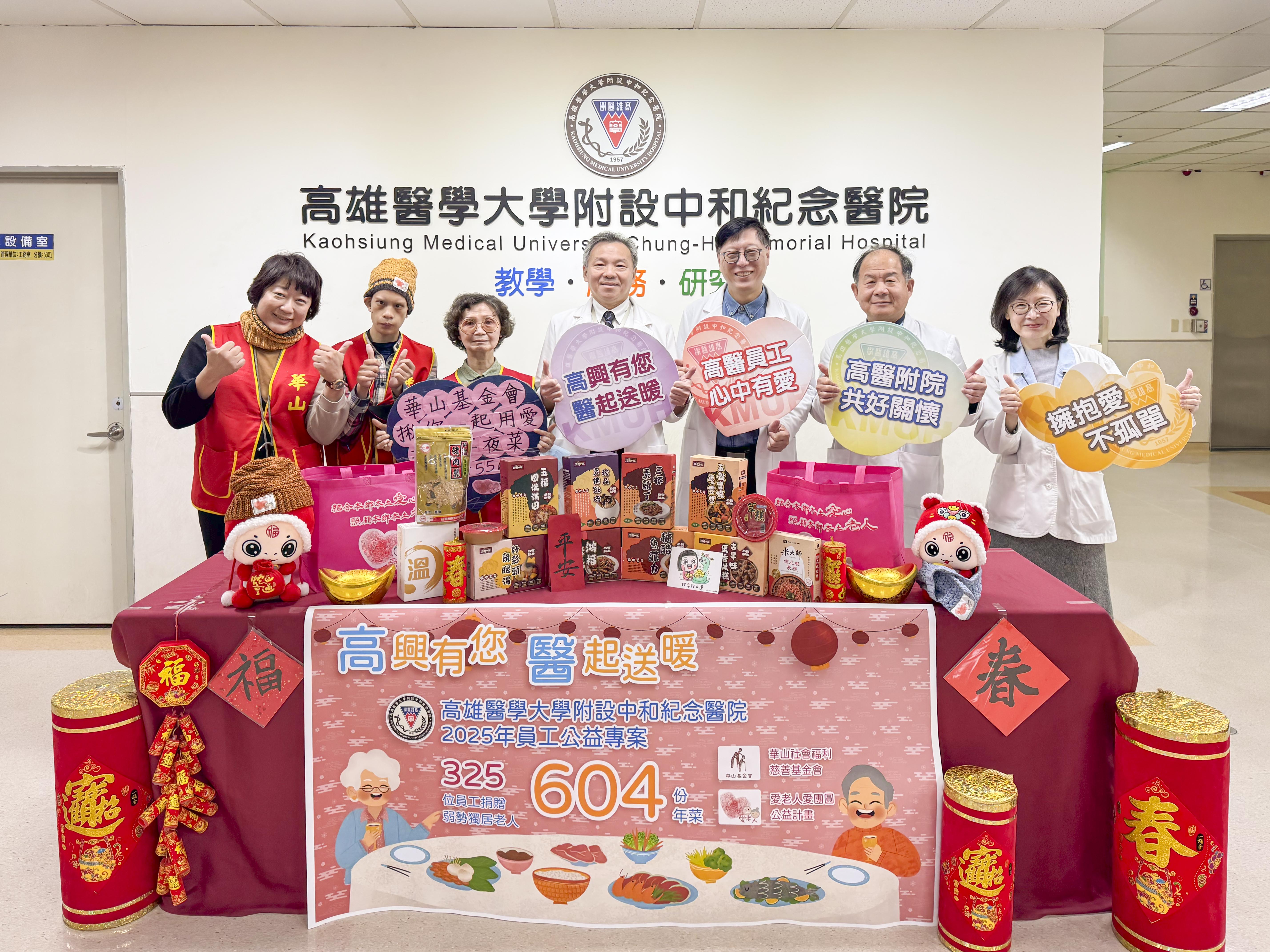 關懷獨居長輩,高雄醫學大學附設中和紀念醫院(下稱高醫)持續三年響應華山基金會「暖心年菜,揪愛送孤老」活動,於院內發起「高興有您,醫起送暖」年菜認購專案,讓在社區中失能、失智、失依的獨居長輩,於農曆春節也能有溫飽暖心的年菜。愛心年菜每份1000元,此次共有325位醫護、醫事、行政人員及志工等熱情響應,共捐出逾60餘萬元,可照顧600餘位社區獨居長者。昨(23)日由高醫程廣義副院長代表同仁捐贈,華山基金會代表受贈。