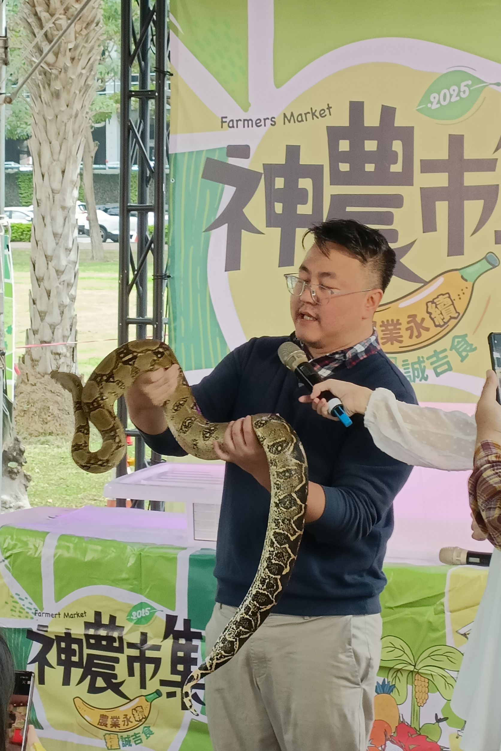 神農市集除了有在地小農展售當令農產之外,呼應金蛇年,特別邀請多家兩棲爬蟲類店家現場販售周邊商品,昨(22)日還舉辦別開生面的爬蟲類講座,邀請台灣兩棲爬蟲動物協會潘頎鈞秘書長帶著巨蟒分享爬蟲類的飼養照護,以活潑生動的解說和互動,摒除大小朋友對牠們「冷血」、「陰森」的刻板印象,對於蛇等爬蟲類有更深的認識。