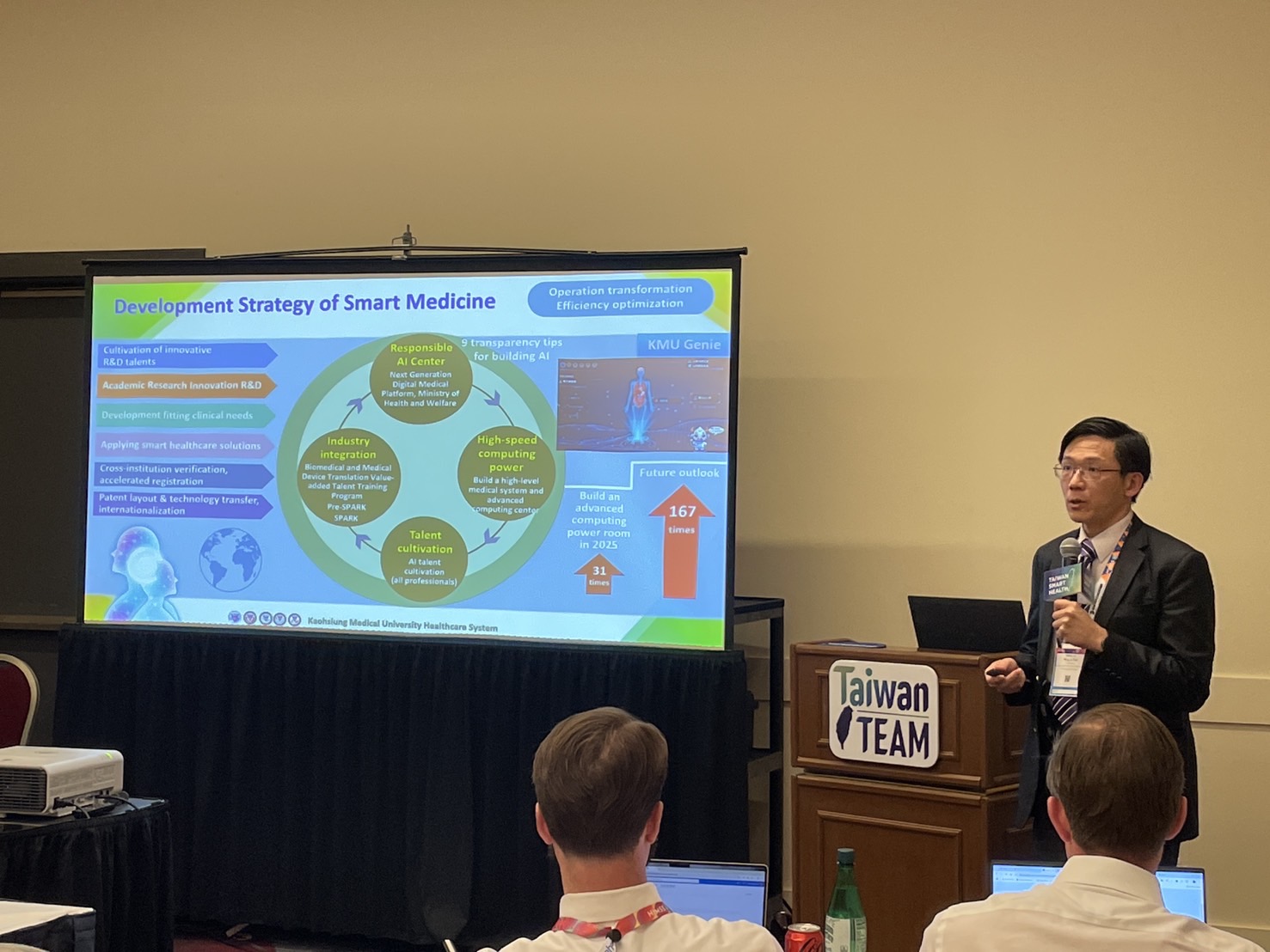 此次HIMSS展覽期間,高醫副院長盧鴻興帶領院長室蔡明儒秘書並攜手洞視科技塗明達執行長,與國際醫療機構及產業專家進行深度交流。高醫攤位有來自全球的貴賓進行國際交流,共同探討AI醫療科技如何助力醫療機構數位轉型,並拓展跨國合作機會。高醫團隊也受邀進行專題演講,分享在智慧醫療領域的最新研究與應用成果,由蔡明儒秘書進行演講分享高醫如何透過AI技術改善加護病房(ICU)風險管理,提高病患安全,並落實低碳醫療願景。