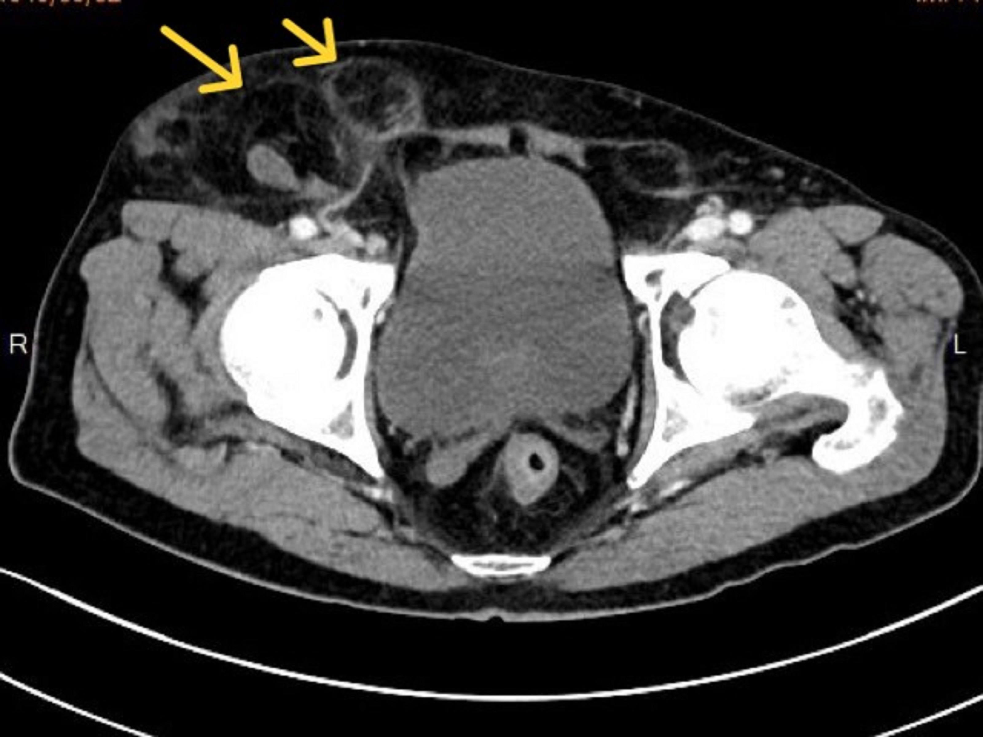 年近八旬的陳伯伯,年輕時因腹股溝疝氣開過兩次傳統手術,近年來經常復發,右下腹靠鼠蹊部位時常「鼓一包」,日前突腹痛難耐就醫,醫師原想徒手幫他復位,但因疝氣造成的突起物實在過於巨大(20*15*10公分),難以一手掌握,影像檢查更發現是罕見的「雙疝氣」,部分小腸及大量網膜組織嵌頓,形成兩個大小不一的疝氣囊,需立即手術以避免腸道壞死。