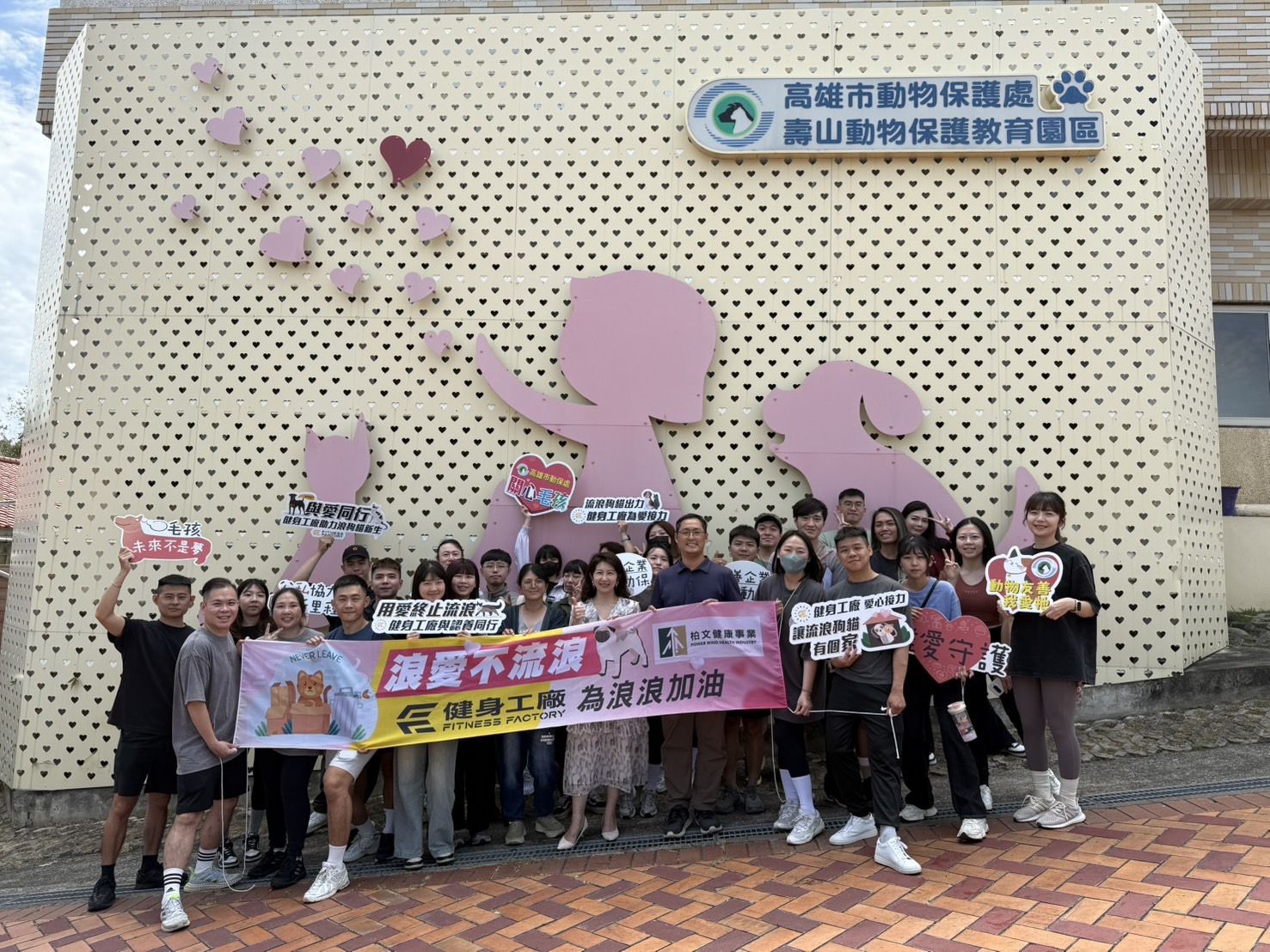 當健身遇上毛孩,會擦出怎樣的火花?今日(4/18)高雄市動物保護處攜手健身工廠(柏文健康事業)在壽山動物保護教育園區首次舉辦「犬貓治癒日-狗狗健身趴」活動,讓平時久坐辦公室的企業員工與收容犬隻一起動起來!這場別開生面的活動不僅是揮灑汗水的健身時刻,更是一場充滿愛與關懷的公益行動,透過運動拉近人與毛孩的距離,不僅充分療癒日常工作辛勞,也讓園內浪浪們同享愛與陪伴,打造毛孩與人們共享健康快樂的美好時光。