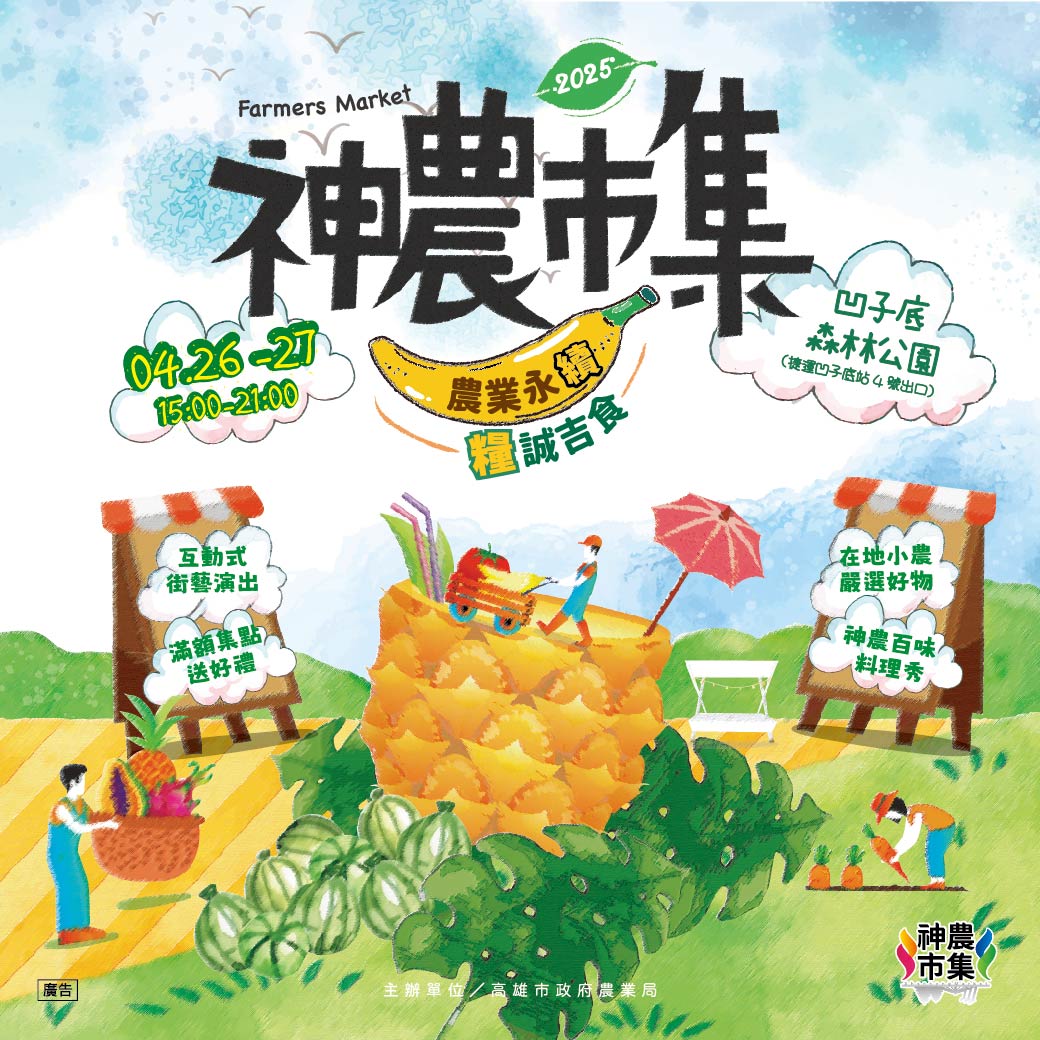 高雄市政府農業局將於4月26日、27日(週六、週日)在凹子底森林公園舉辦「神農市集」,本月聚焦推廣高雄春夏交替之際的當季農特產品,現場集結多樣在地小農精選農產,從天然蜂蜜、季節蔬菜、有機水果,到風味獨特的醃漬品、飲品等,呈現高雄豐饒的農業面貌。不論你是來市集的家庭主婦、年輕族群,還是關注農業永續的消費者,都能在市集中發掘來自土地的純粹滋味。此外,現場更安排精彩的料理秀、魔術秀與音樂表演,為春日午後增添療癒氛圍,讓逛市集也能充滿驚喜與樂趣。