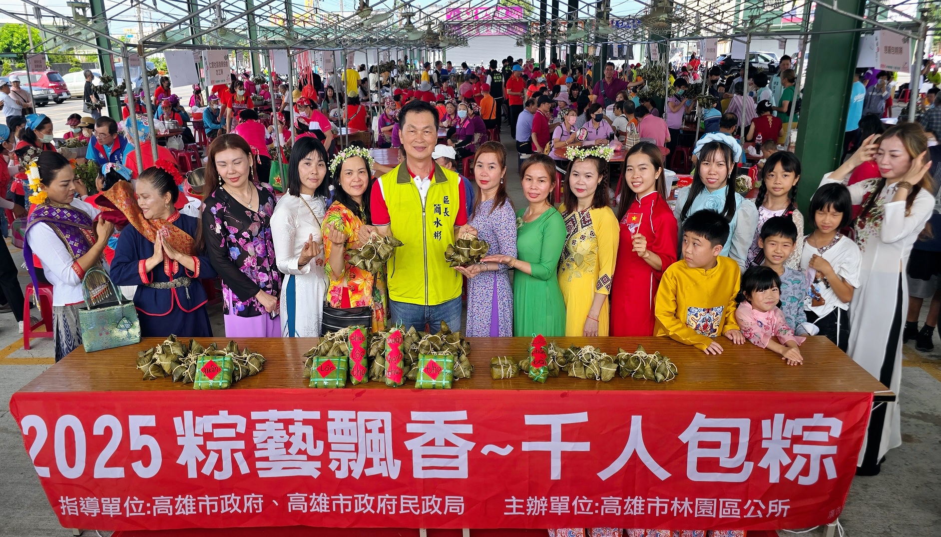 【本報記者陳明成高雄報導】2025高雄端午龍舟嘉年華系列活動粽藝飄香25日上午在林園夜市廣場展開,凝聚林園區各里辦公處社區發展協會以及新住民朋友共60隊,千人齊心包粽,中油公司石化事業部免費提供1000隻冰棒分享現場民眾消暑!