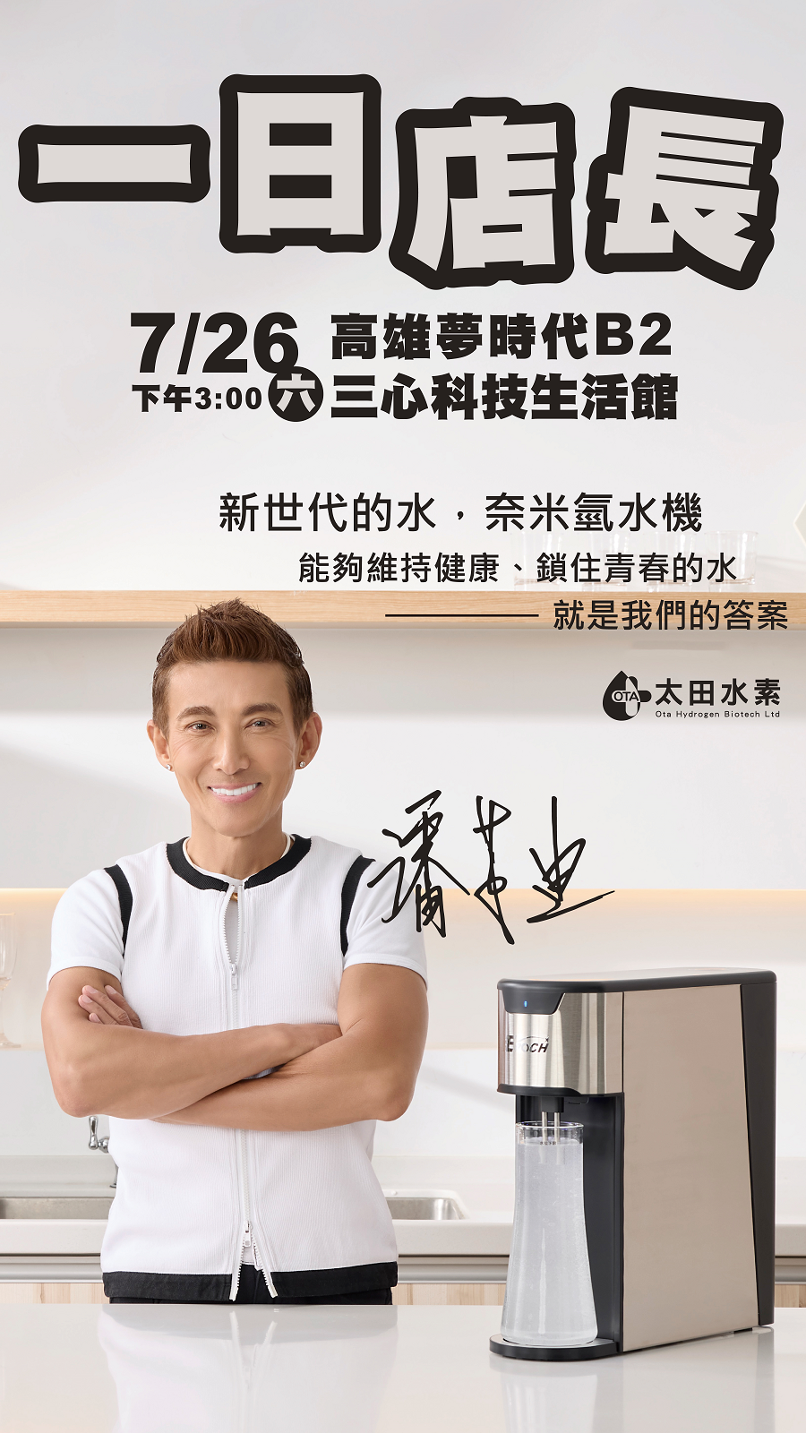 【本報記者陳明成高雄報導】健康活力的代名詞—潘若迪老師,26日(六)下午3點現身高雄夢時代B2三心科技生活館,擔任「太田水素 OTA 奈米氫水機」一日店長!這場限時限地的快閃活動,結合健康、科技與娛樂,將帶來一場前所未有的能量盛宴,邀請所有喜愛健康生活的民眾一同參與!