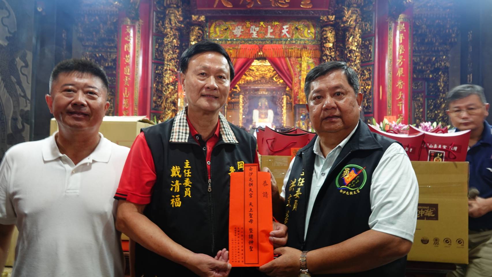 在高雄市長陳其邁與許智傑立委等人的促成下16日特地北上苗栗通霄拱天宮送上大帖,誠摯邀請深受信眾敬仰的「白沙屯媽祖」南下高雄共同參與此次三山媽祖遶境盛會,拱天宮主委洪文華受邀表示很樂意南下參與此一盛會,「白沙屯媽祖」將於於12月6~7日南下參與岡山壽天宮主辦的「高雄三山媽祖平安祈福遶境」活動。