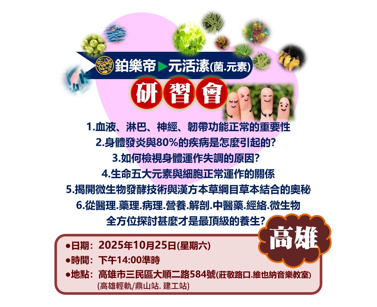 【本報記者陳明成高雄報導】現代生物科技結合道家醫學中「藥食同源」養生哲學,孕育出百草酵溸元炁食補的元活溸,希望透過教育模式提供有益的訊息給消費者,定10 月25日在高雄市大順二路584號與莊敬路口的維也納音樂教室辦研習會,邀請對健康養生有興趣的民眾參與。