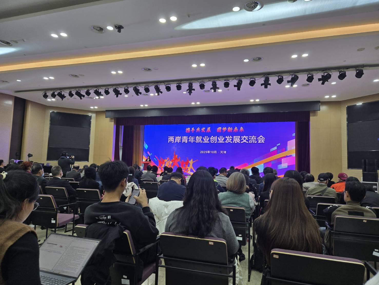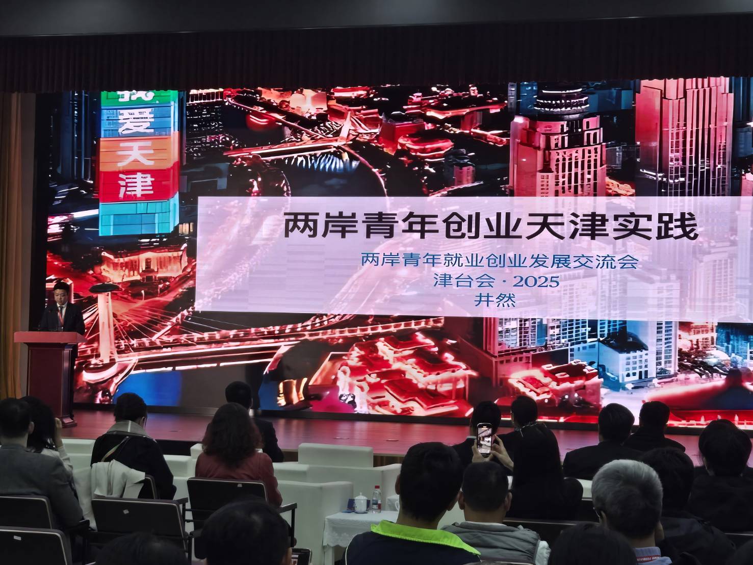 「攜手共發展 圓夢新未來」為主題的「兩岸青年就業創業發展交流會」,由天津市台辦主任靳凡主持,聚焦台青關切的就業創業議題。包括中國國民黨中常委、全台青工總會總會長鄭任宗,馬英九文教基金會執行長蕭旭岑,台灣工商建設研究會理事長雷宏毅,苗栗縣副縣長邱俐俐,苗栗縣議員徐功凡,國民黨苗栗縣黨部主委邱一峰,台灣技職教育產業發展協會理事長魏煜成,新北市青工總會總會長游貫中,台灣青年創新創業協會執行長王文鴻等。大陸方面則有兩岸企業家峰會中小企業合作及青年創業推進小組辦公室主任李偉、副主任陳建萍等人,及、臺灣政界人士、青年代表,在津就業創業的兩岸青年代表出席與會。