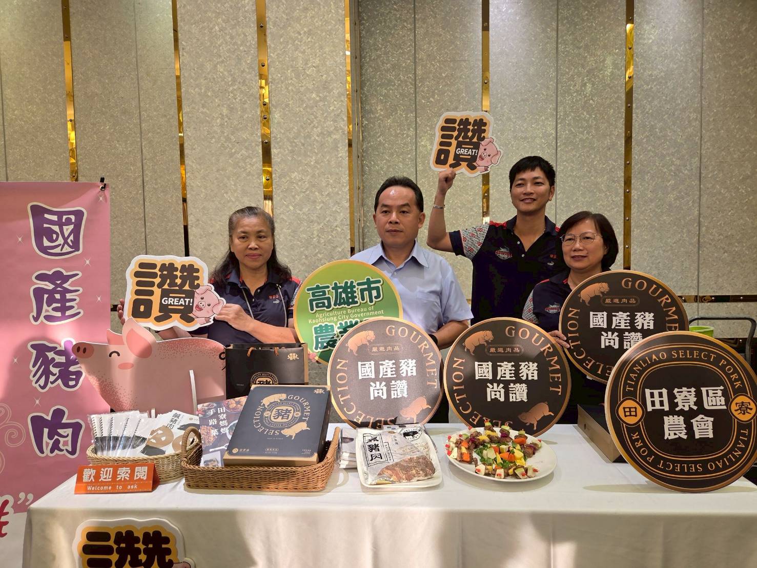 特別值得一提,田寮農會也利用此機會介紹田那提品牌豬肉產品,請大家品嚐Q彈美味的鹹豬肉果串,農業局強調國產豬肉經屠宰衛生檢查合格,食用安全無虞;非洲豬瘟不會人畜傳染切勿過度恐慌,呼籲在地旅館業者力挺高雄在地新鮮的國產豬肉以及各項美味產品。